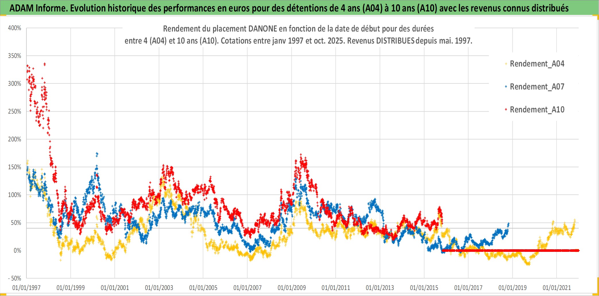 Site dédié aux investisseursPage dédiée sur site financeAnalyse des valorisations hebdomadaires de l'action DANONE. Cet actif est cote en EUR. Les valorisations couvrent les semaines 1997W01 a 2025W44. Les revenus de cet actif financier sont pris en compte depuis la semaine 1997W21. La note globale ESG de cet actif est estimee a 10.0 (apres rebasage entre 0 et 20).