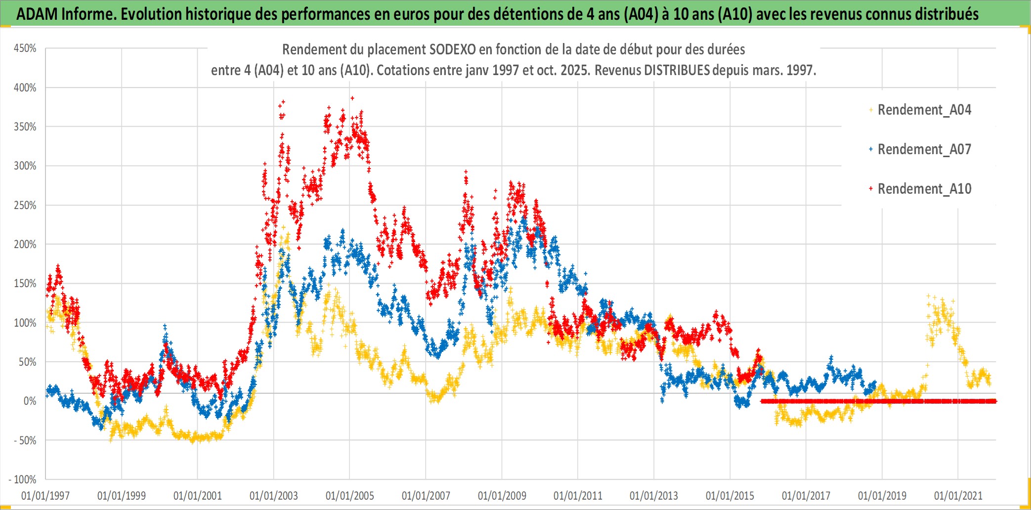 Site dédié aux investisseursPage dédiée sur site financeAnalyse des valorisations hebdomadaires de l'action SODEXO. Cet actif est cote en EUR. Les valorisations couvrent les semaines 1997W01 a 2025W44. Les revenus de cet actif financier sont pris en compte depuis la semaine 1997W10. La note globale ESG de cet actif est estimee a 9.0 (apres rebasage entre 0 et 20).