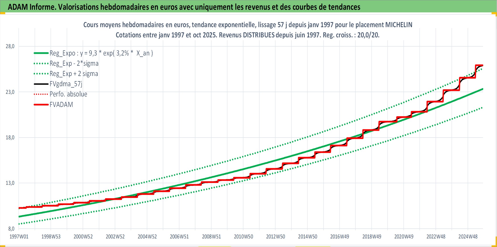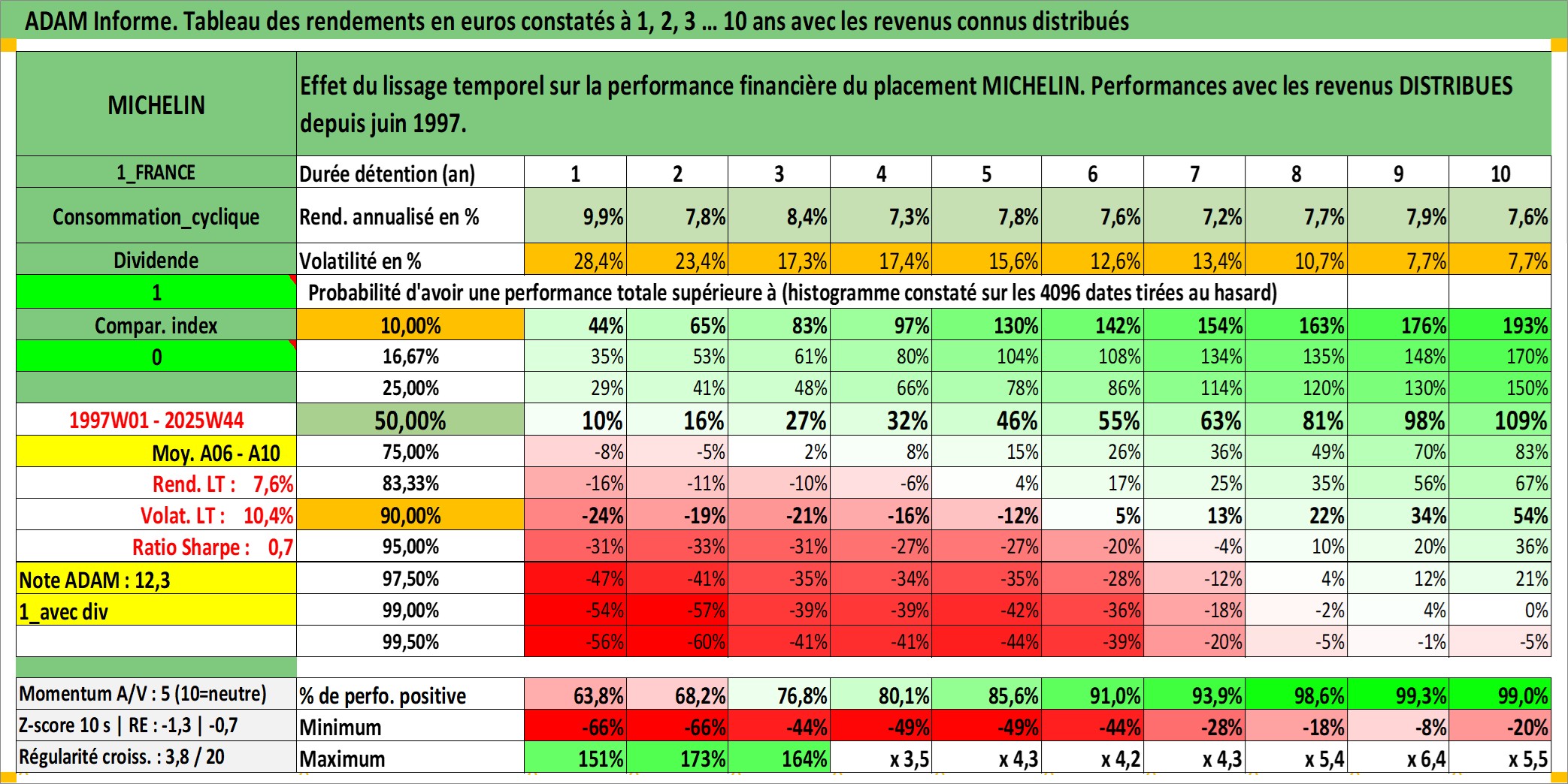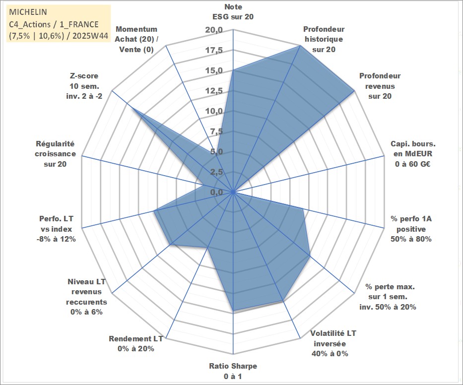 Site dédié aux investisseursPage dédiée sur site financeAnalyse des valorisations hebdomadaires de l'action MICHELIN. Cet actif est cote en EUR. Les valorisations couvrent les semaines 1997W01 a 2025W44. Les revenus de cet actif financier sont pris en compte depuis la semaine 1997W25. La note globale ESG de cet actif est estimee a 15.0 (apres rebasage entre 0 et 20).