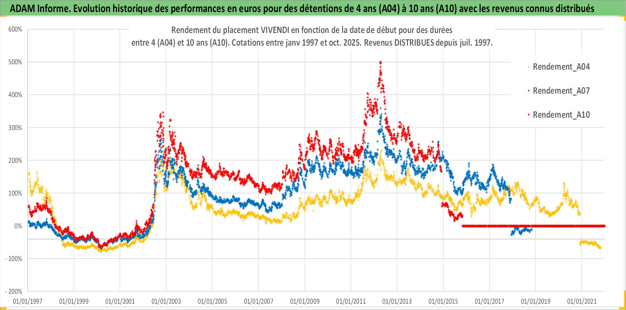 Site dédié aux investisseursPage dédiée sur site financeAnalyse des valorisations hebdomadaires de l'action VIVENDI. Cet actif est cote en EUR. Les valorisations couvrent les semaines 1997W01 a 2025W44. Les revenus de cet actif financier sont pris en compte depuis la semaine 1997W27. La note globale ESG de cet actif est estimee a 16.0 (apres rebasage entre 0 et 20).
