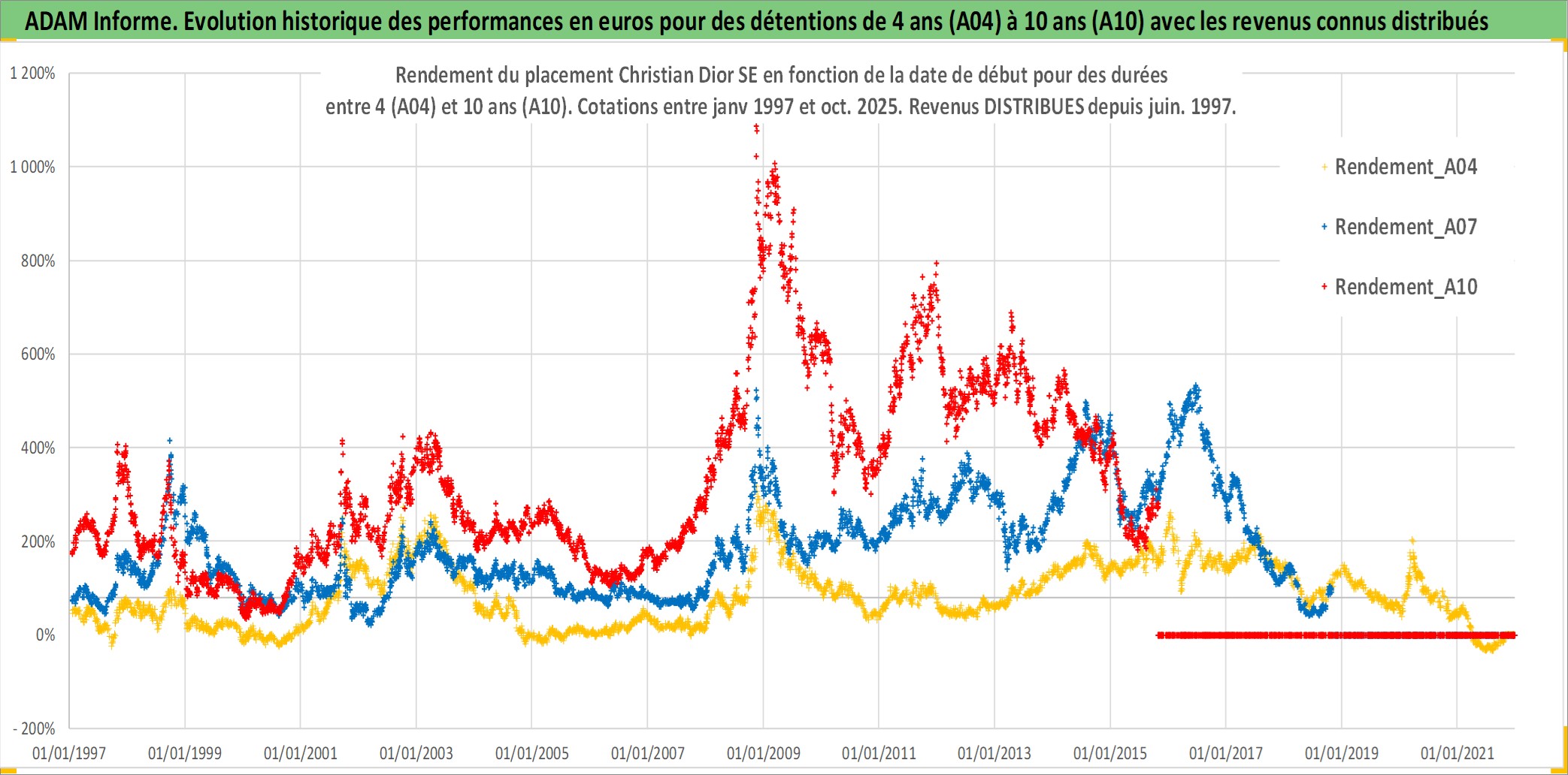 Site dédié aux investisseursPage dédiée sur site financeAnalyse des valorisations hebdomadaires de l'action Christian Dior SE. Cet actif est cote en EUR. Les valorisations couvrent les semaines 1997W01 a 2025W44. Les revenus de cet actif financier sont pris en compte depuis la semaine 1997W25. La note globale ESG de cet actif est estimee a 11.0 (apres rebasage entre 0 et 20).