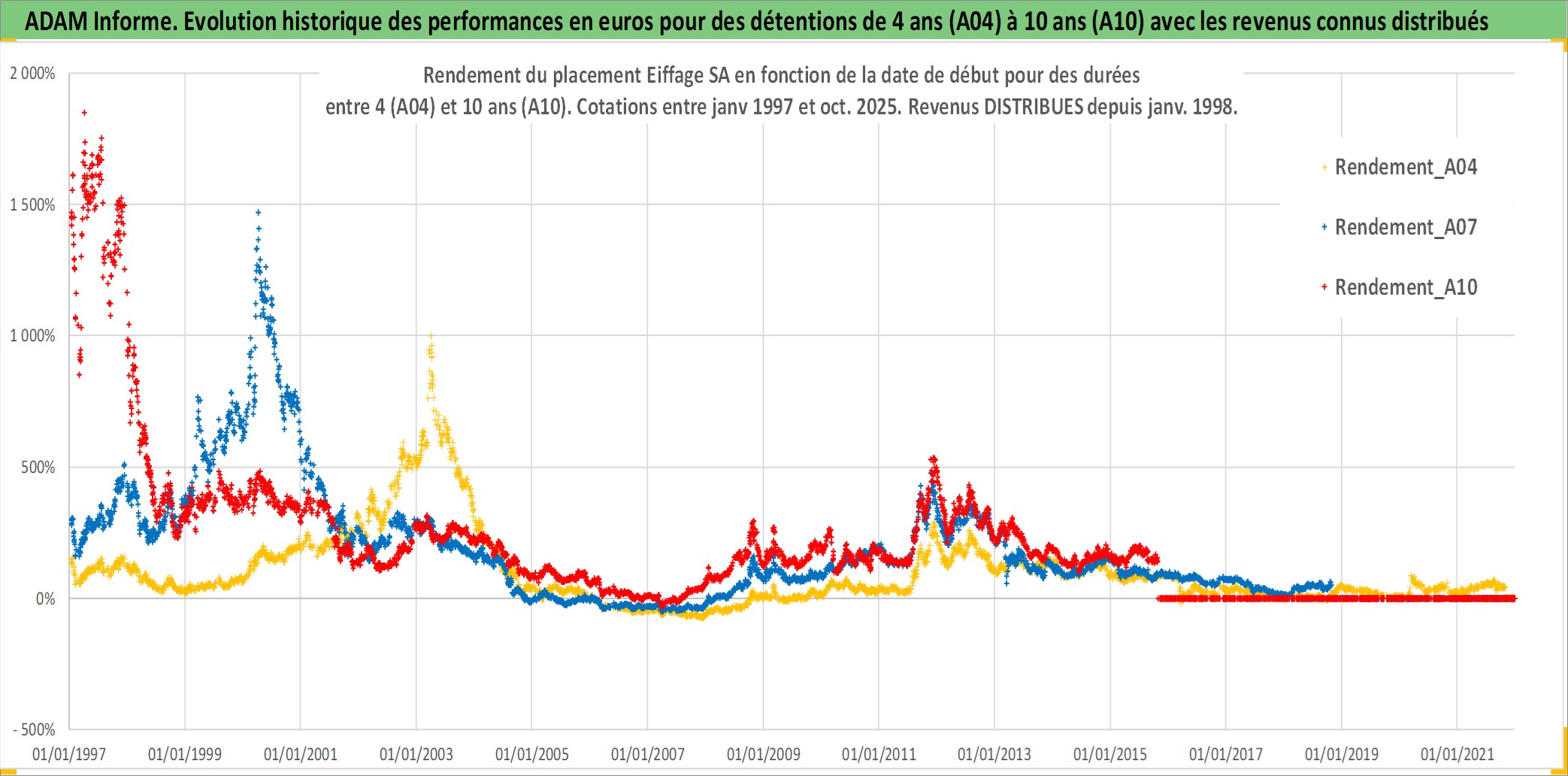 Site dédié aux investisseursPage dédiée sur site financeAnalyse des valorisations hebdomadaires de l'action Eiffage SA. Cet actif est cote en EUR. Les valorisations couvrent les semaines 1997W01 a 2025W44. Les revenus de cet actif financier sont pris en compte depuis la semaine 1998W01. La note globale ESG de cet actif est estimee a 3.0 (apres rebasage entre 0 et 20).