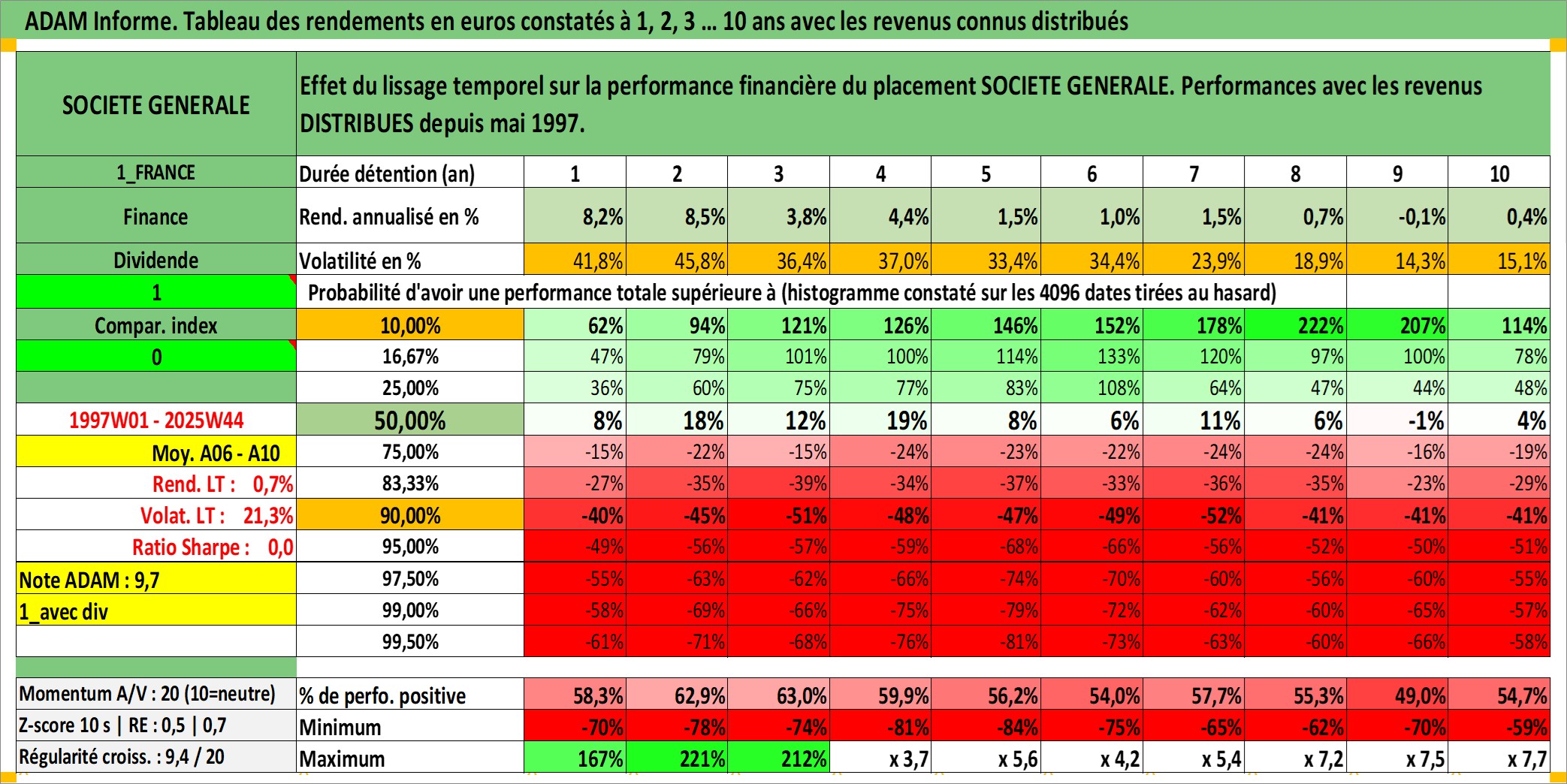 Site dédié aux investisseursPage dédiée sur site financeAnalyse des valorisations hebdomadaires de l'action SOCIETE GENERALE. Cet actif est cote en EUR. Les valorisations couvrent les semaines 1997W01 a 2025W44. Les revenus de cet actif financier sont pris en compte depuis la semaine 1997W21. La note globale ESG de cet actif est estimee a 10.0 (apres rebasage entre 0 et 20).