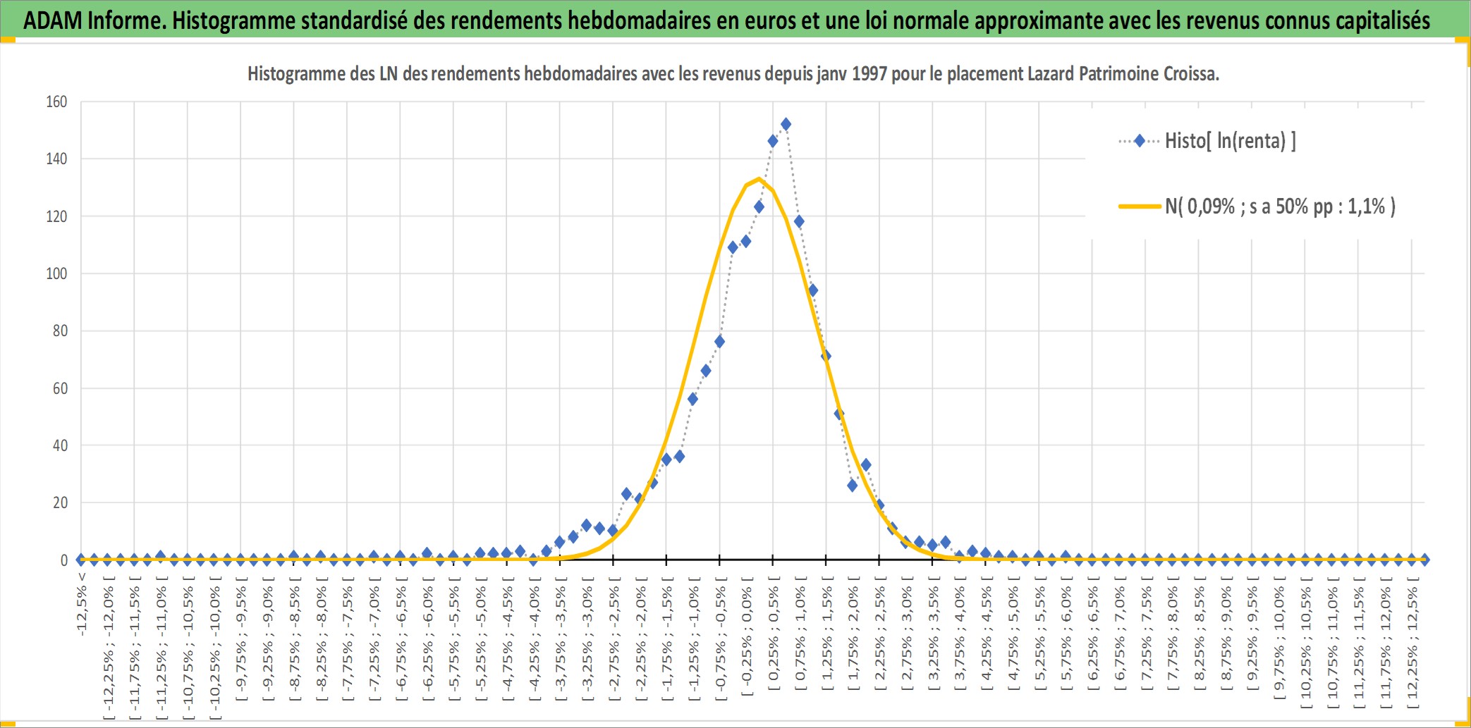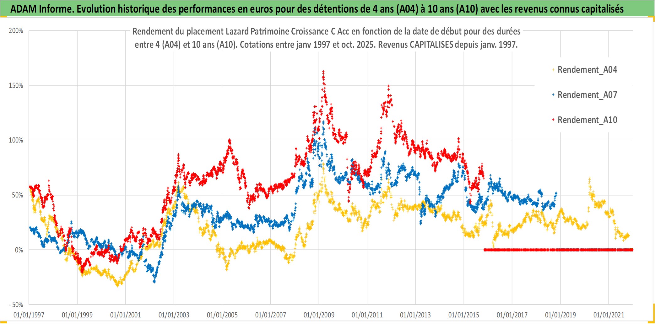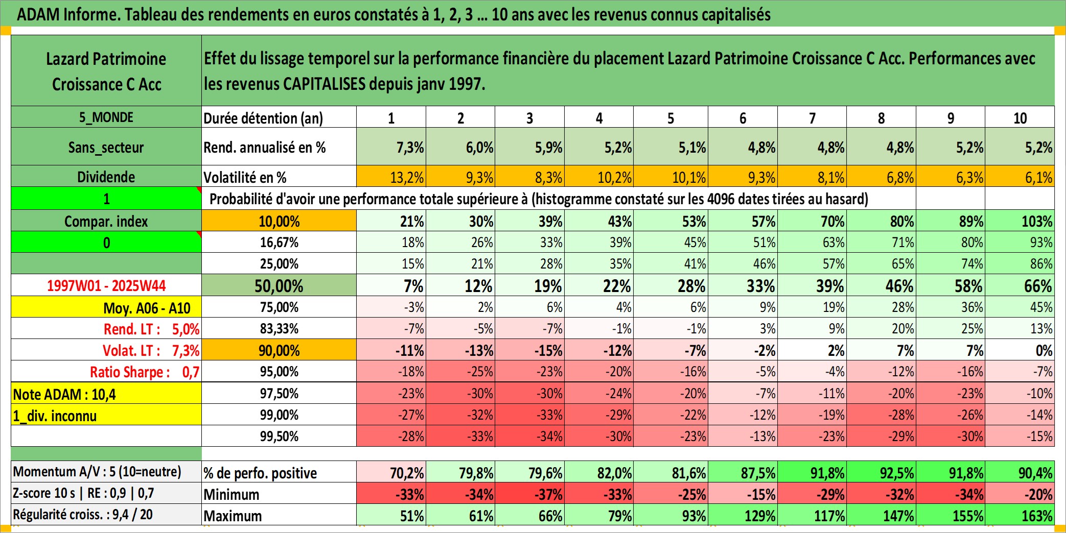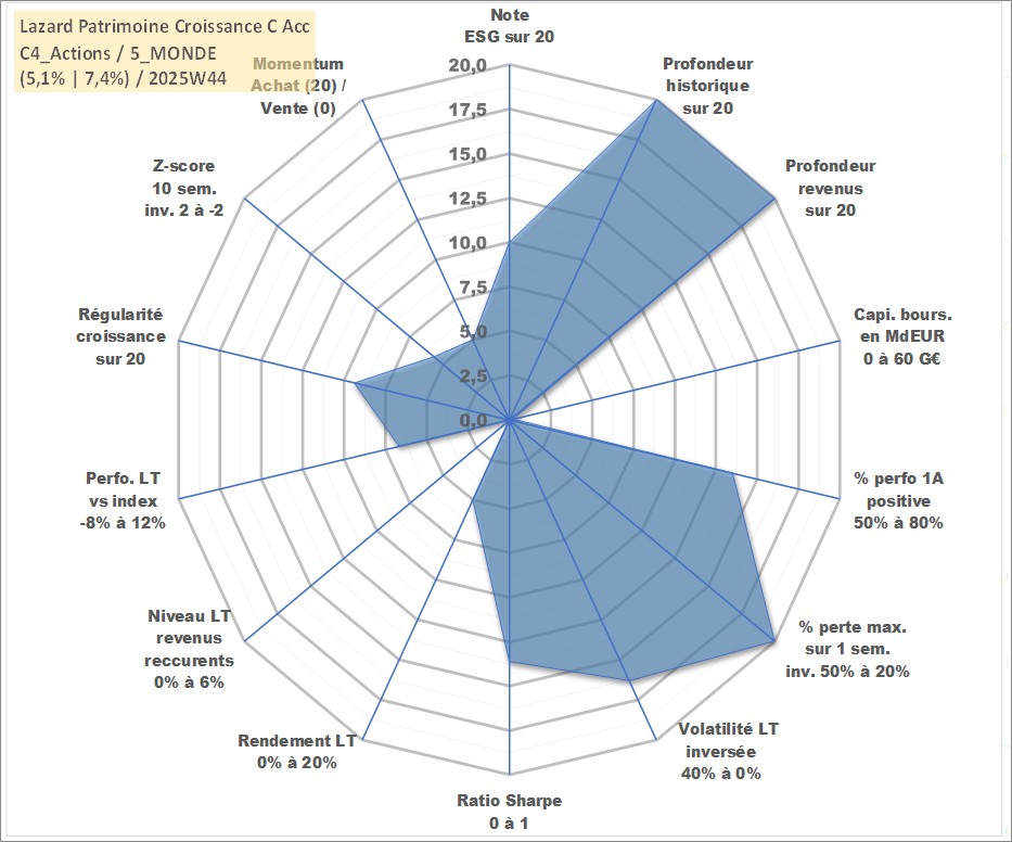 Site dédié aux investisseursPage dédiée sur site financeAnalyse des valorisations hebdomadaires du fonds Lazard Patrimoine Croissance C Acc. Cet actif est cote en EUR. Les valorisations couvrent les semaines 1997W01 a 2025W44. Les revenus de cet actif financier sont pris en compte depuis la semaine 1997W01. La note globale ESG de cet actif est estimee a 10.0 (apres rebasage entre 0 et 20).
