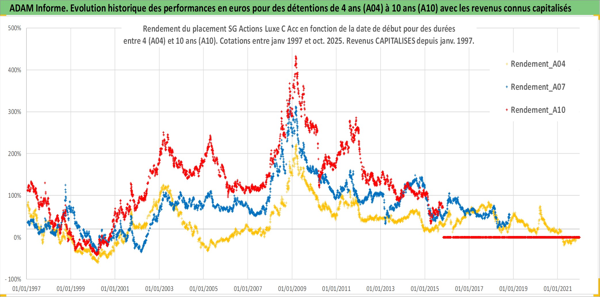 Site dédié aux investisseursPage dédiée sur site financeAnalyse des valorisations hebdomadaires du fonds SG Actions Luxe C Acc. Cet actif est cote en EUR. Les valorisations couvrent les semaines 1997W01 a 2025W44. Les revenus de cet actif financier sont pris en compte depuis la semaine 1997W01. La note globale ESG de cet actif est estimee a 13.0 (apres rebasage entre 0 et 20).