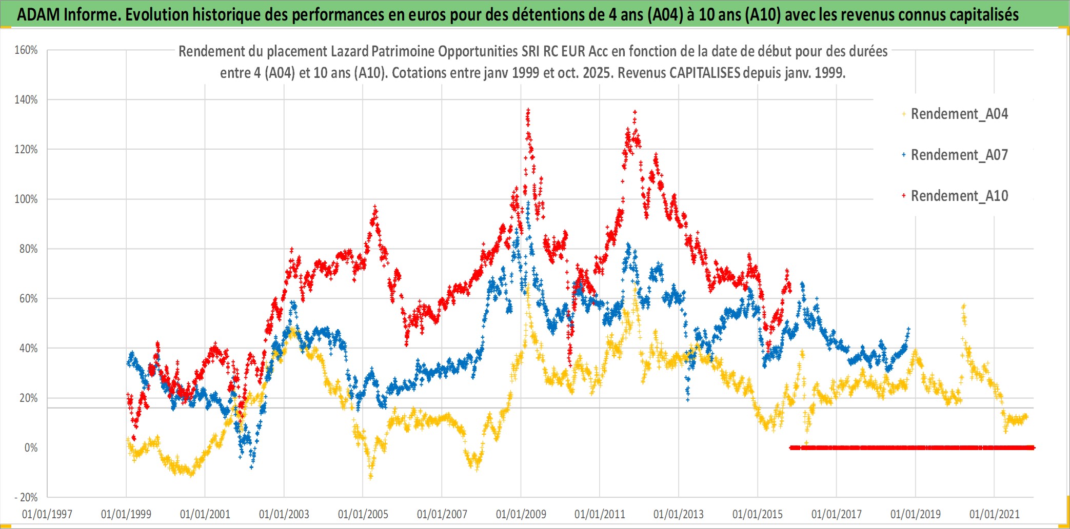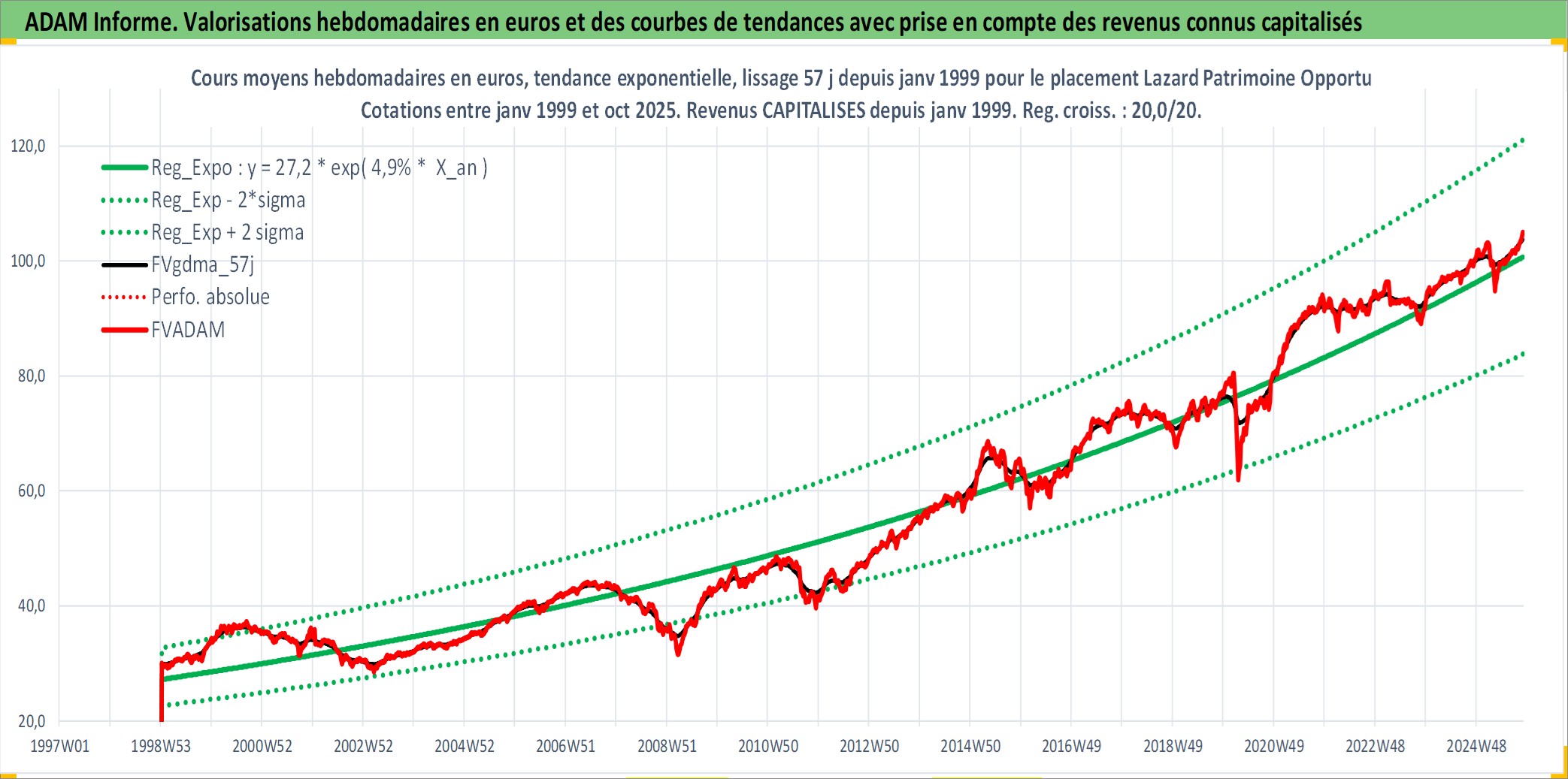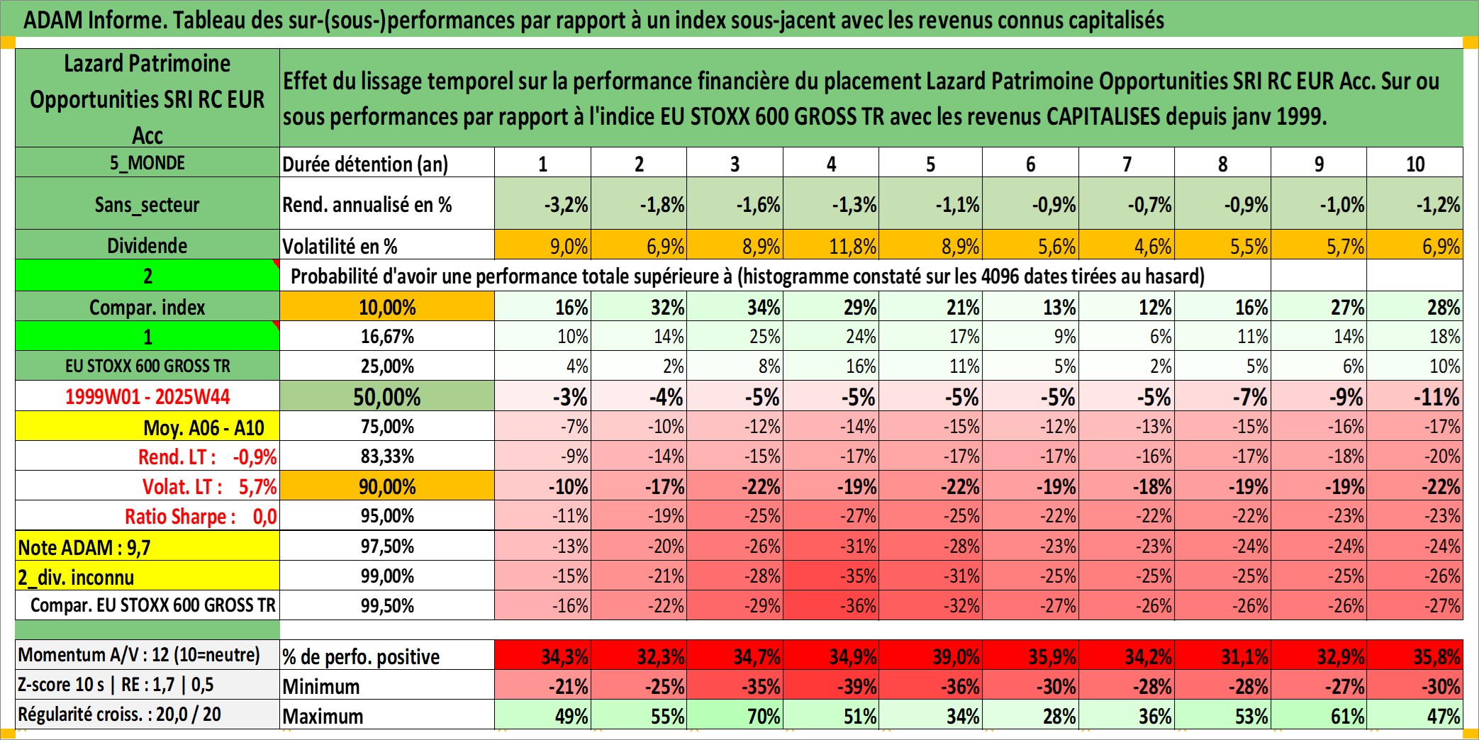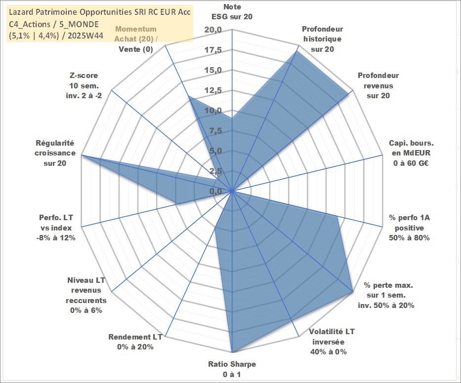 Site dédié aux investisseursPage dédiée sur site financeAnalyse des valorisations hebdomadaires du fonds Lazard Patrimoine Opportunities SRI RC EUR Acc. Cet actif est cote en EUR. Les valorisations couvrent les semaines 1999W01 a 2025W44. Les revenus de cet actif financier sont pris en compte depuis la semaine 1999W01. La note globale ESG de cet actif est estimee a 9.0 (apres rebasage entre 0 et 20).