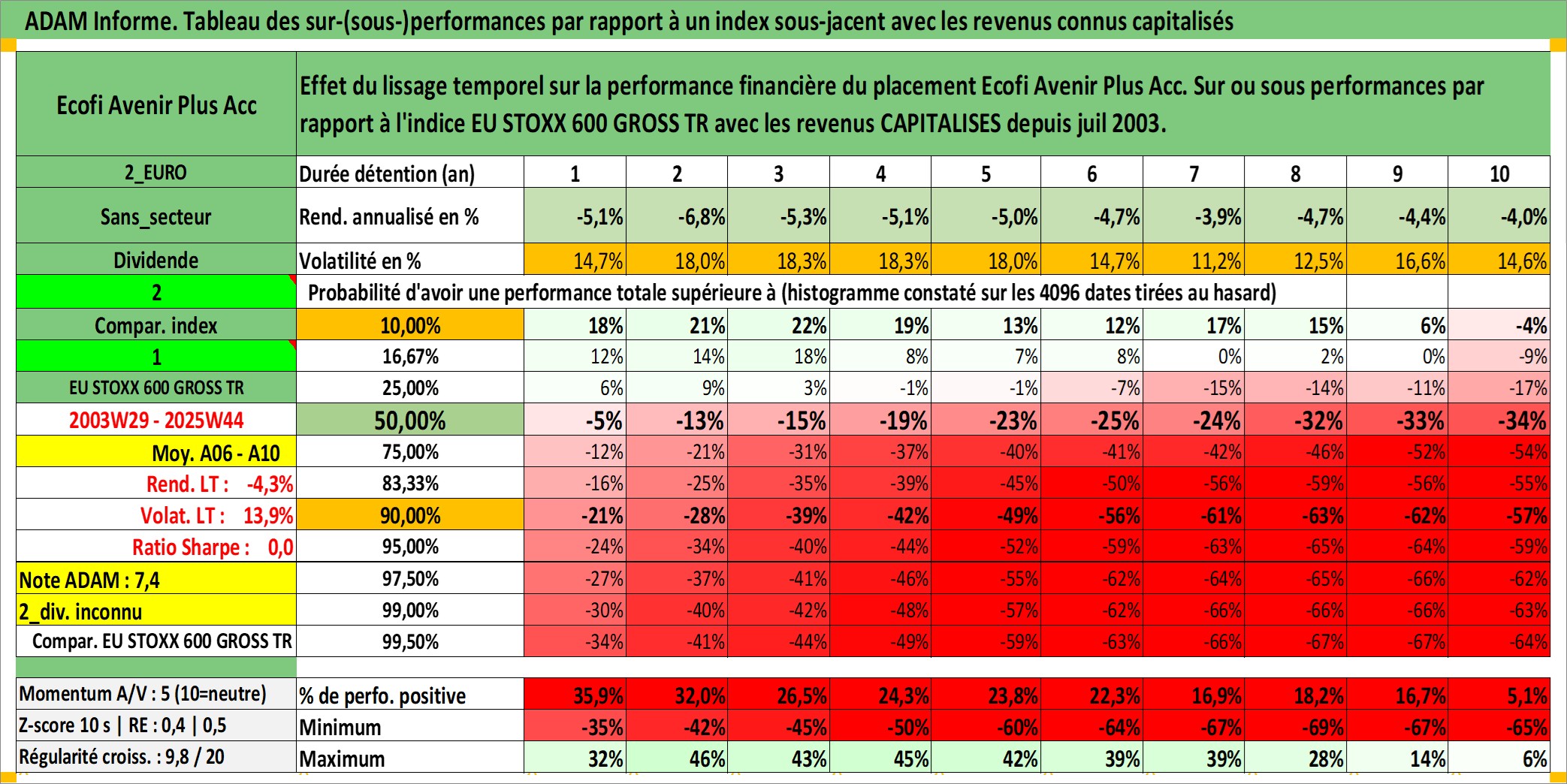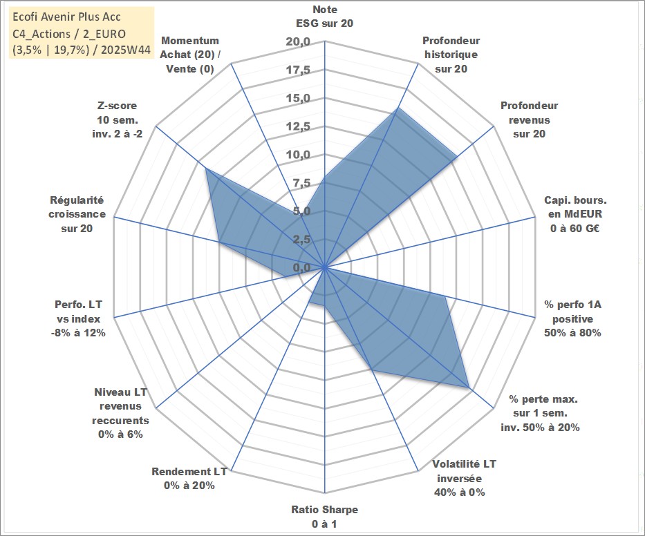 Site dédié aux investisseursPage dédiée sur site financeAnalyse des valorisations hebdomadaires du fonds Ecofi Avenir Plus Acc. Cet actif est cote en EUR. Les valorisations couvrent les semaines 2003W29 a 2025W44. Les revenus de cet actif financier sont pris en compte depuis la semaine 2003W29. La note globale ESG de cet actif est estimee a 8.0 (apres rebasage entre 0 et 20).