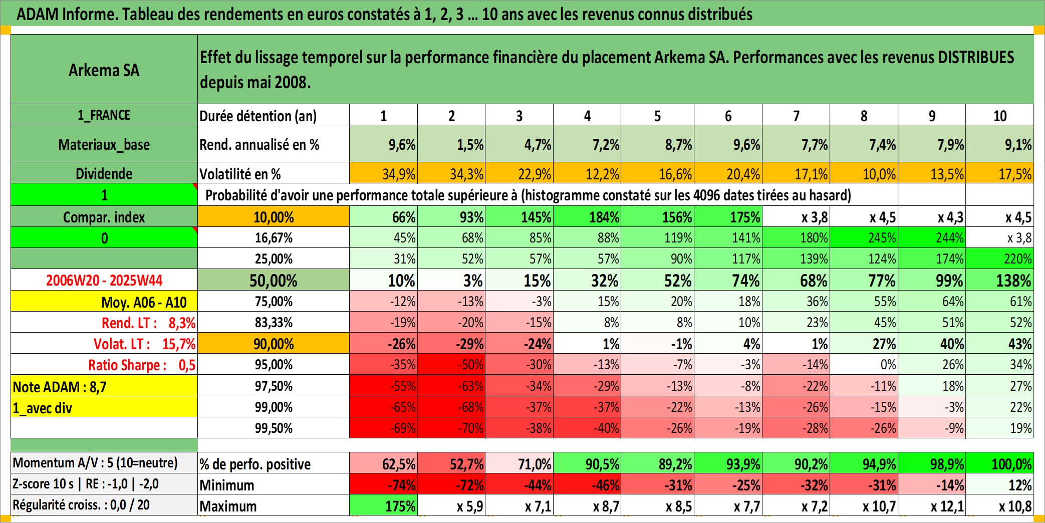 Site dédié aux investisseursPage dédiée sur site financeAnalyse des valorisations hebdomadaires de l'action Arkema SA. Cet actif est cote en EUR. Les valorisations couvrent les semaines 2006W20 a 2025W44. Les revenus de cet actif financier sont pris en compte depuis la semaine 2008W21. La note globale ESG de cet actif est estimee a 10.0 (apres rebasage entre 0 et 20).