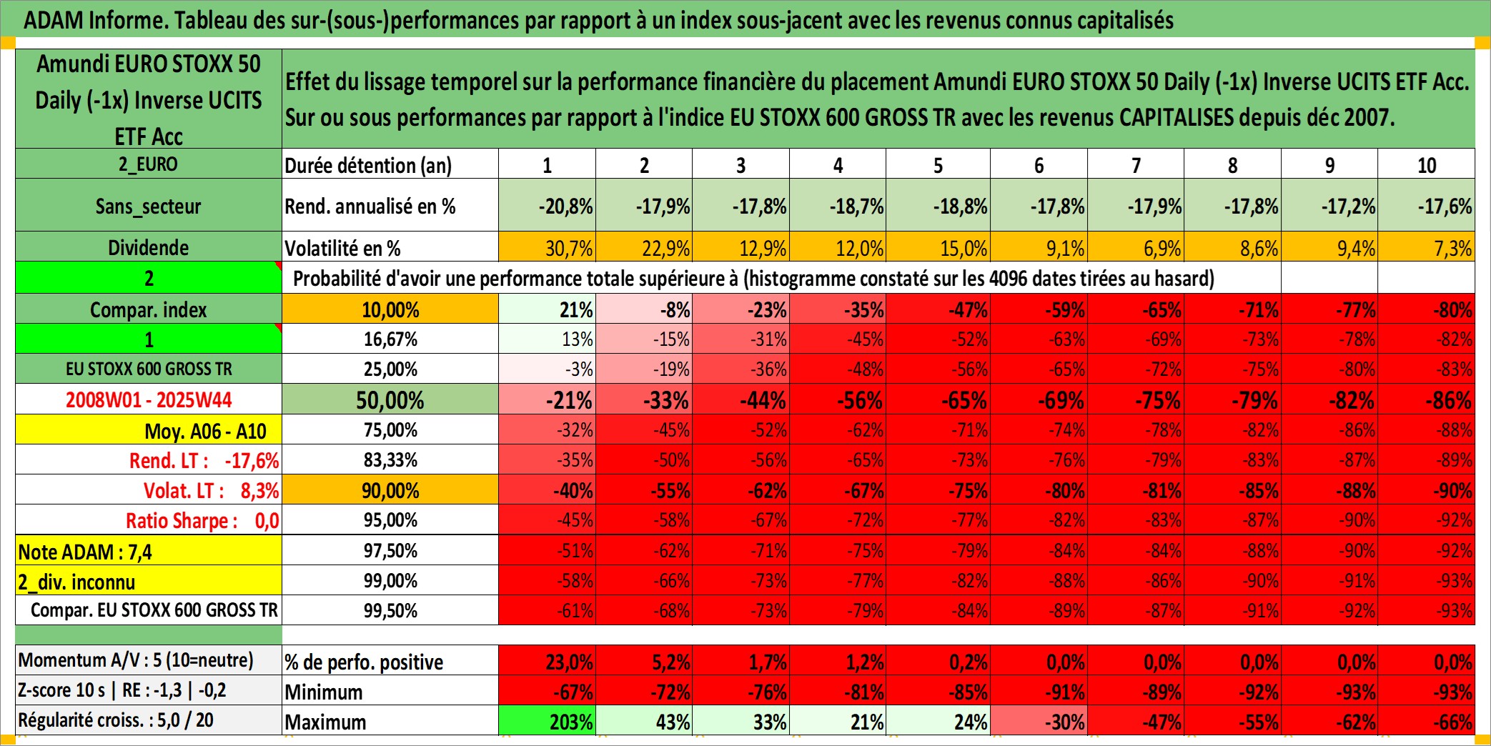 Site dédié aux investisseursPage dédiée sur site financeAnalyse des valorisations hebdomadaires du fonds Amundi EURO STOXX 50 Daily (-1x) Inverse UCITS ETF Acc. Cet actif est cote en EUR. Les valorisations couvrent les semaines 2008W01 a 2025W44. Les revenus de cet actif financier sont pris en compte depuis la semaine 2008W01. La note ESG de cet actif n'est pas connue.