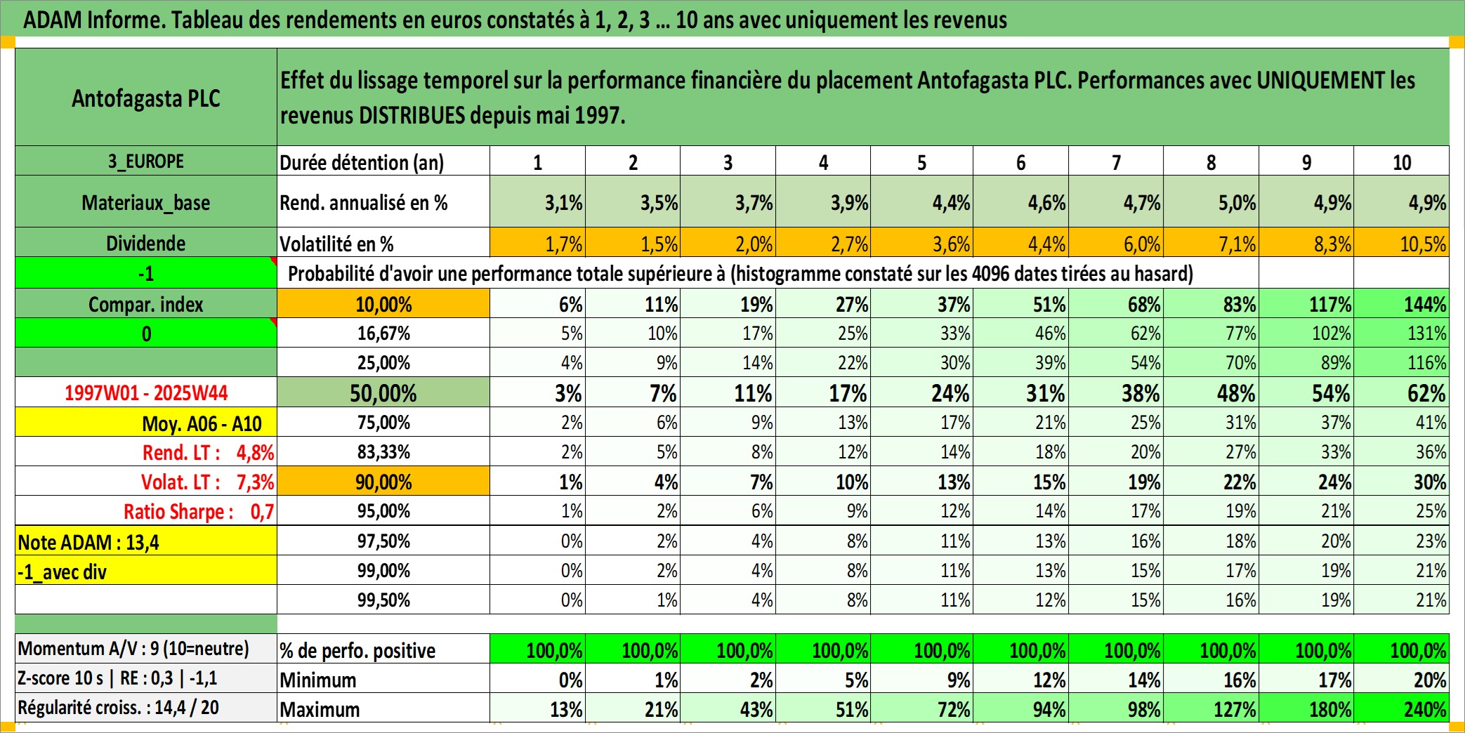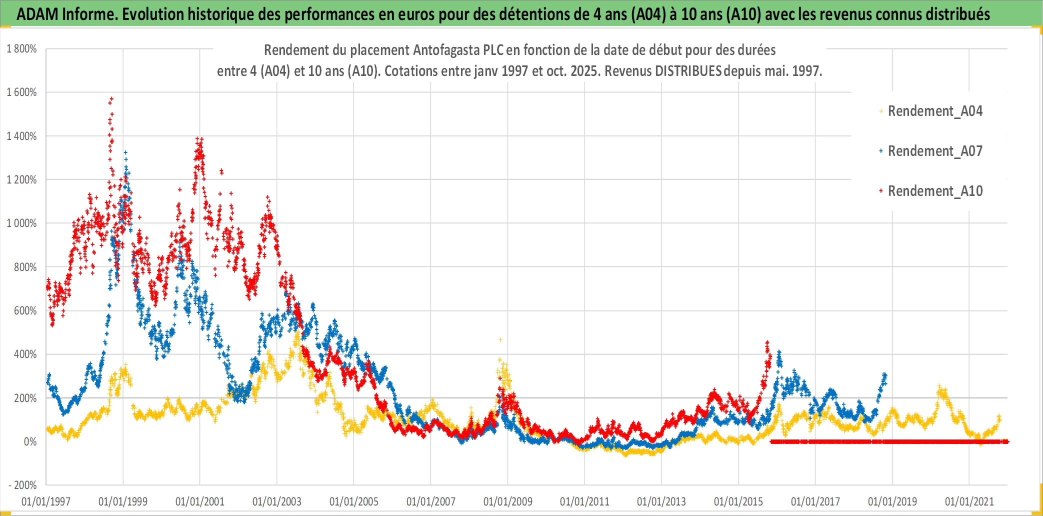 Site dédié aux investisseursPage dédiée sur site financeAnalyse des valorisations hebdomadaires de l'action Antofagasta PLC. Cet actif est cote en GBX. Les valorisations sont en contrevaleur EURO et couvrent les semaines 1997W01 a 2025W44. Les revenus de cet actif financier sont pris en compte depuis la semaine 1997W21. La note globale ESG de cet actif est estimee a 7.0 (apres rebasage entre 0 et 20).