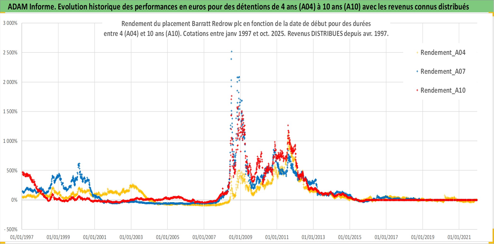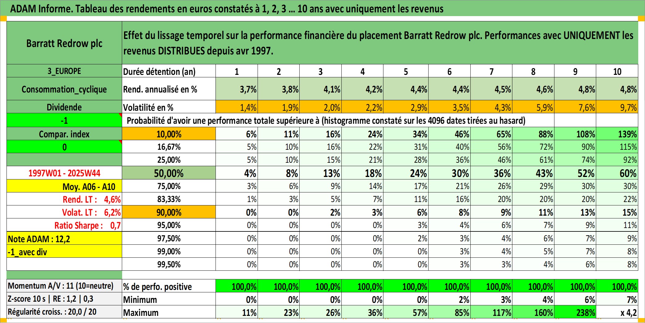 Site dédié aux investisseursPage dédiée sur site financeAnalyse des valorisations hebdomadaires de l'action Barratt Redrow plc. Cet actif est cote en GBX. Les valorisations sont en contrevaleur EURO et couvrent les semaines 1997W01 a 2025W44. Les revenus de cet actif financier sont pris en compte depuis la semaine 1997W15. La note globale ESG de cet actif est estimee a 15.0 (apres rebasage entre 0 et 20).