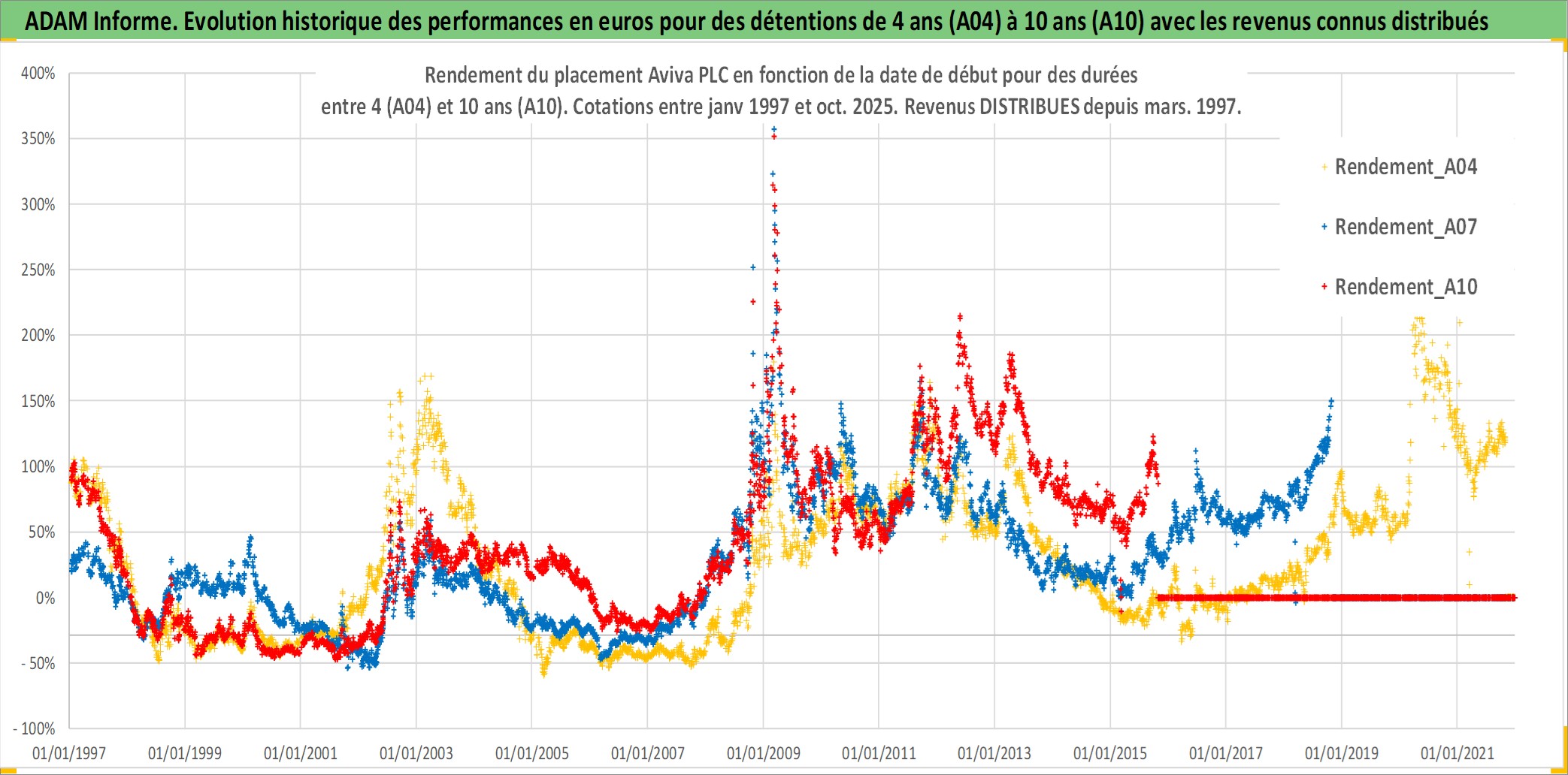 Site dédié aux investisseursPage dédiée sur site financeAnalyse des valorisations hebdomadaires de l'action Aviva PLC. Cet actif est cote en GBX. Les valorisations sont en contrevaleur EURO et couvrent les semaines 1997W01 a 2025W44. Les revenus de cet actif financier sont pris en compte depuis la semaine 1997W11. La note globale ESG de cet actif est estimee a 16.0 (apres rebasage entre 0 et 20).