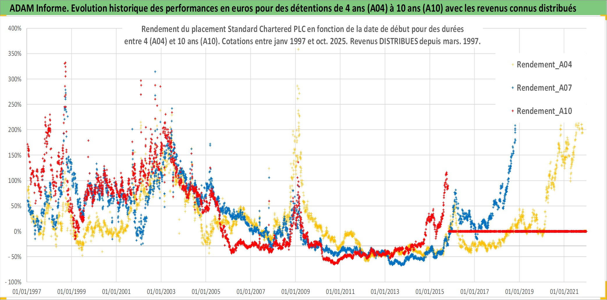Site dédié aux investisseursPage dédiée sur site financeAnalyse des valorisations hebdomadaires de l'action Standard Chartered PLC. Cet actif est cote en GBX. Les valorisations sont en contrevaleur EURO et couvrent les semaines 1997W01 a 2025W44. Les revenus de cet actif financier sont pris en compte depuis la semaine 1997W11. La note globale ESG de cet actif est estimee a 7.0 (apres rebasage entre 0 et 20).