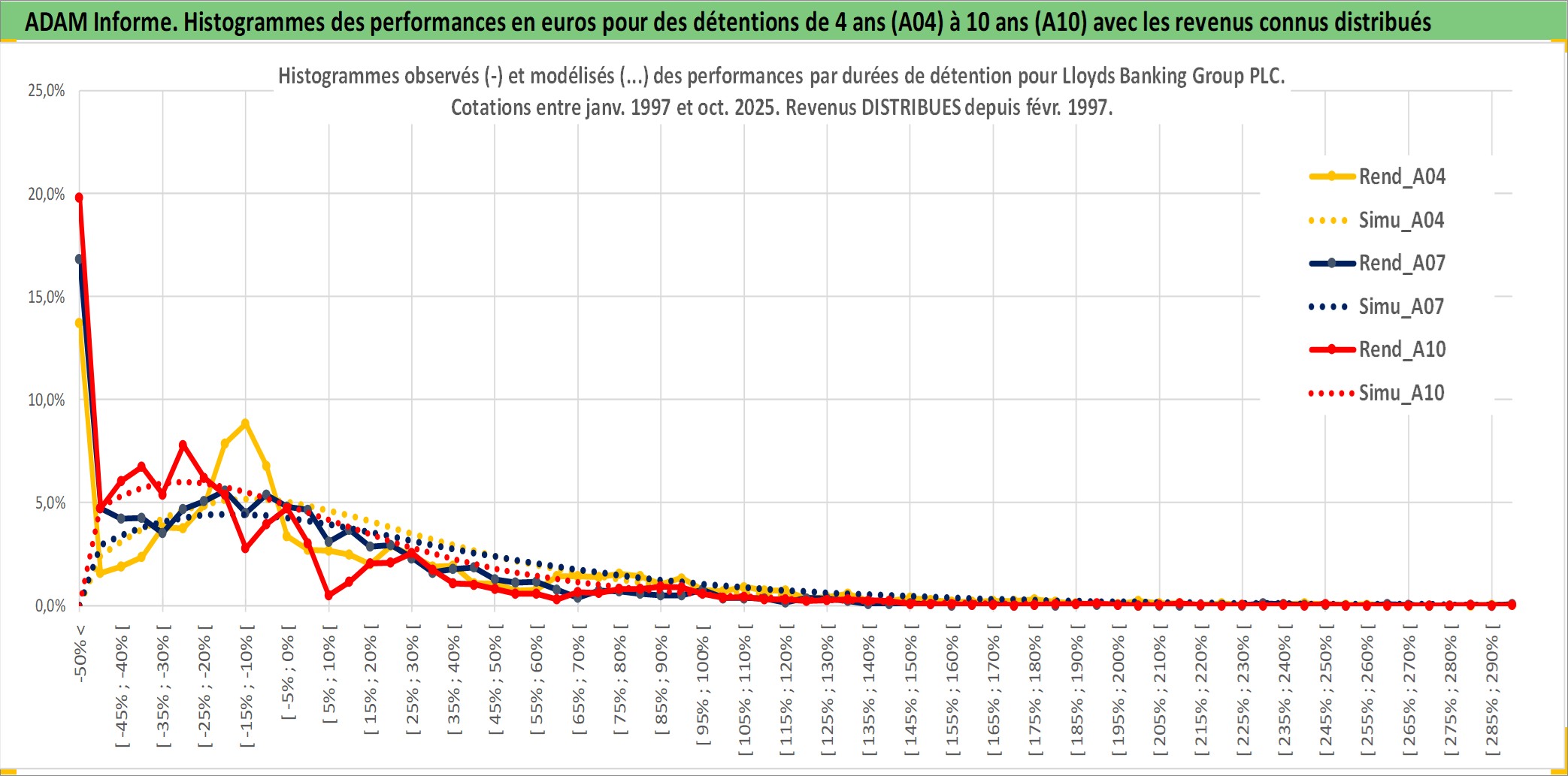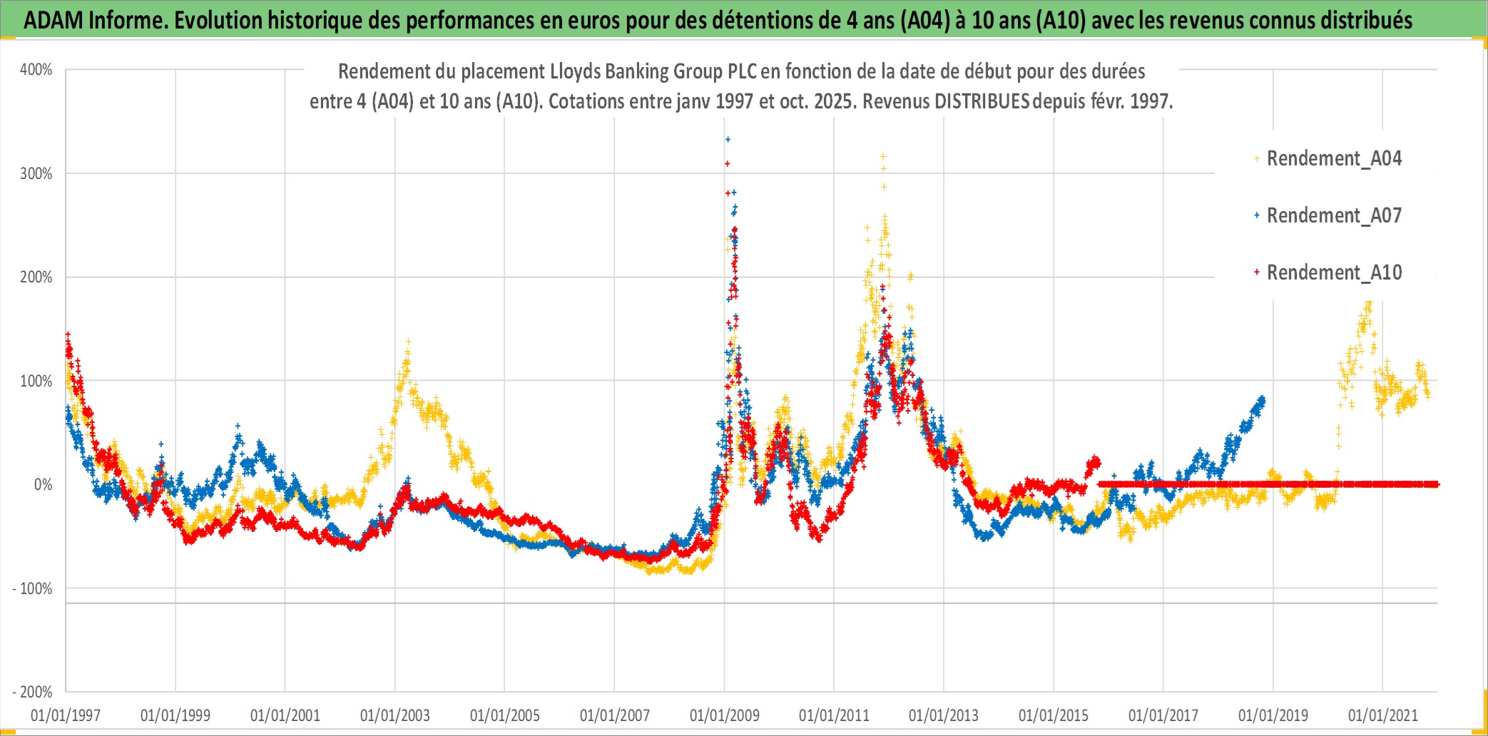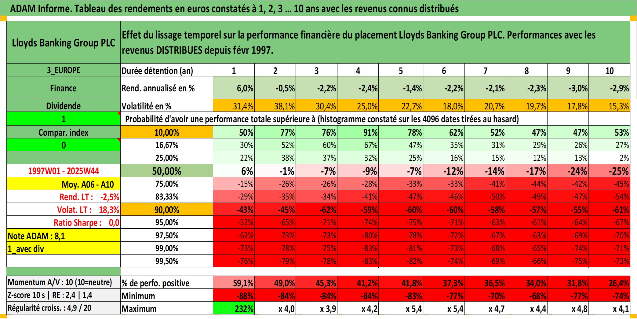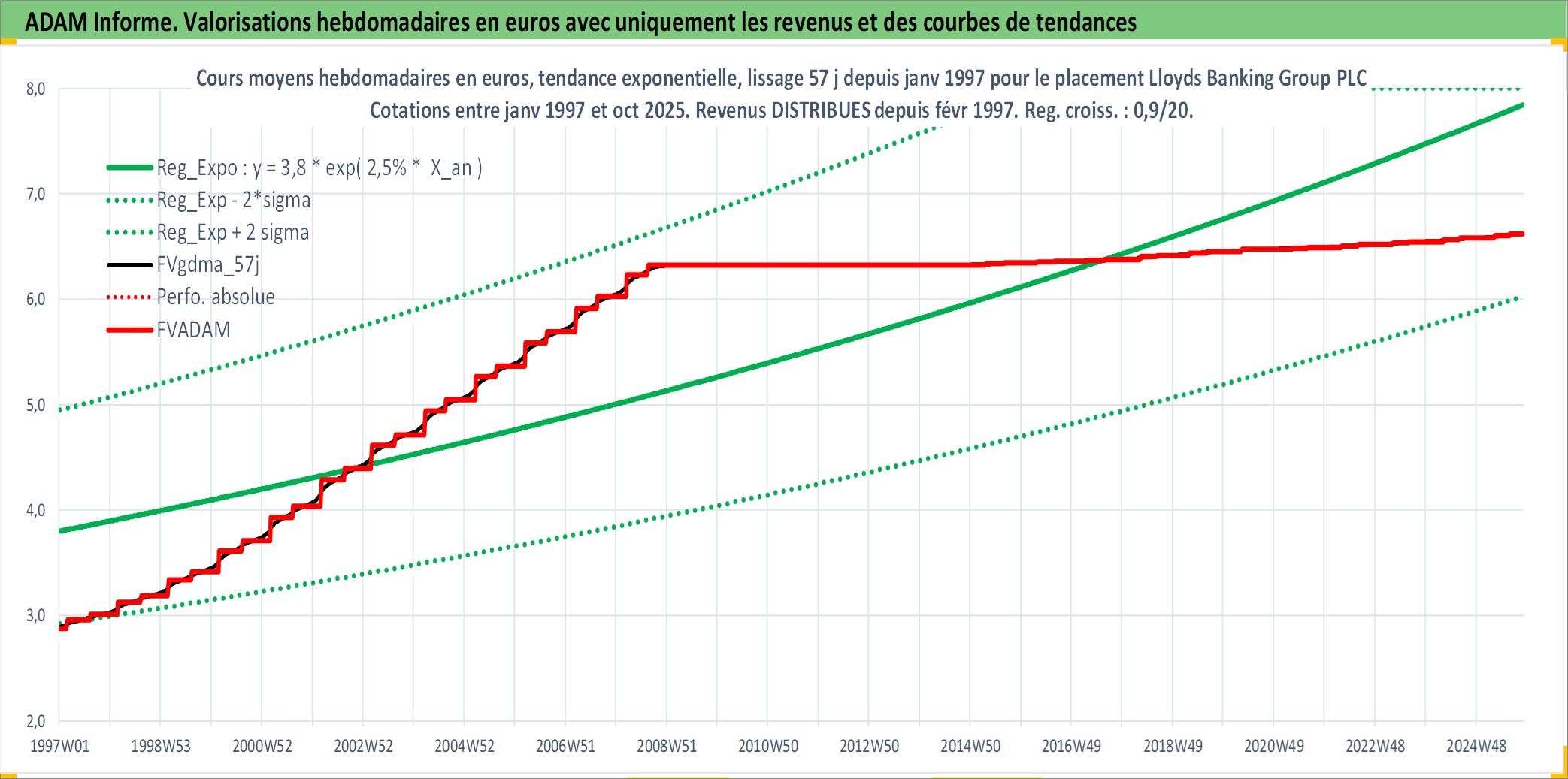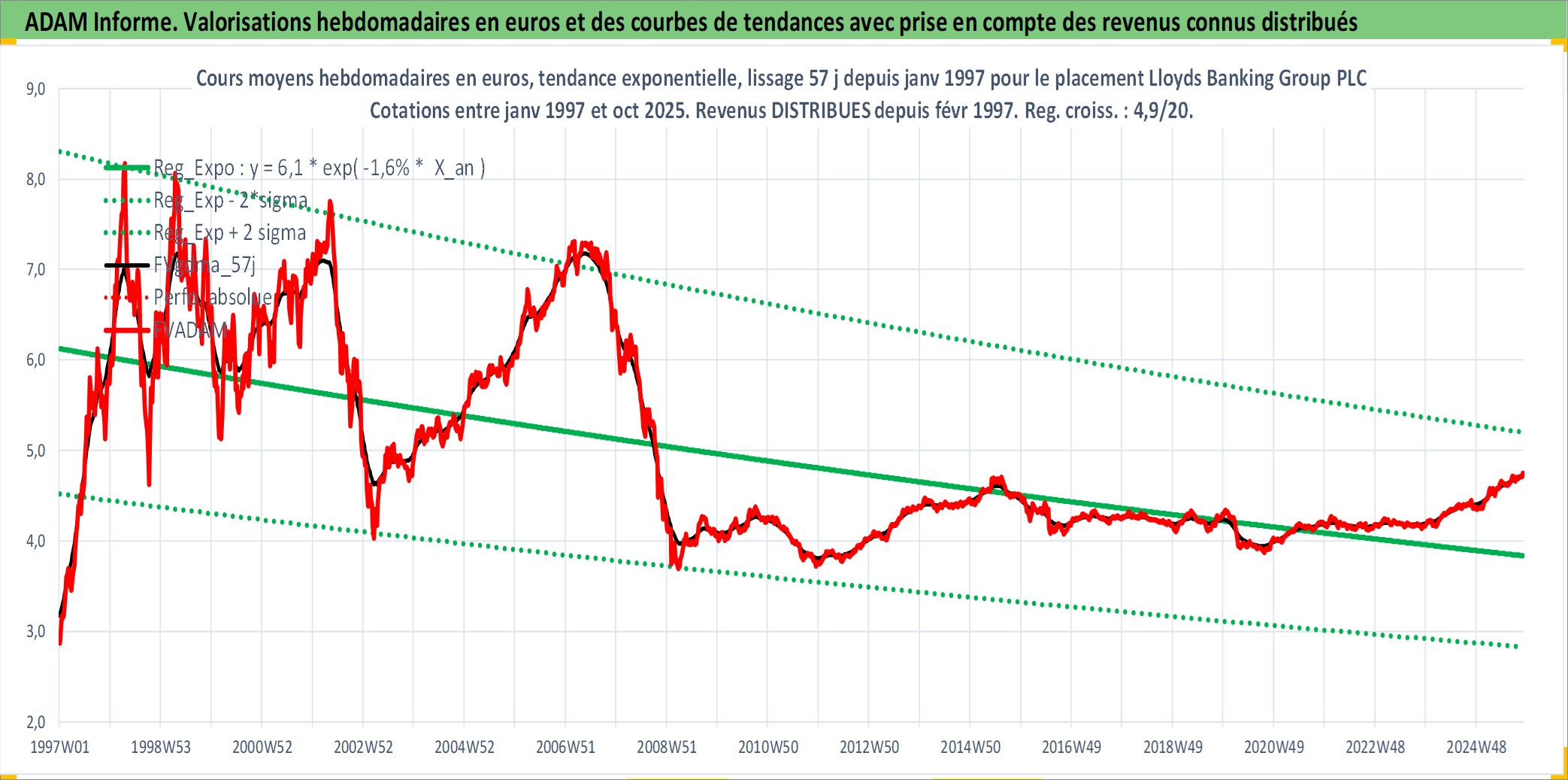 Site dédié aux investisseursPage dédiée sur site financeAnalyse des valorisations hebdomadaires de l'action Lloyds Banking Group PLC. Cet actif est cote en GBX. Les valorisations sont en contrevaleur EURO et couvrent les semaines 1997W01 a 2025W44. Les revenus de cet actif financier sont pris en compte depuis la semaine 1997W09. La note globale ESG de cet actif est estimee a 10.0 (apres rebasage entre 0 et 20).