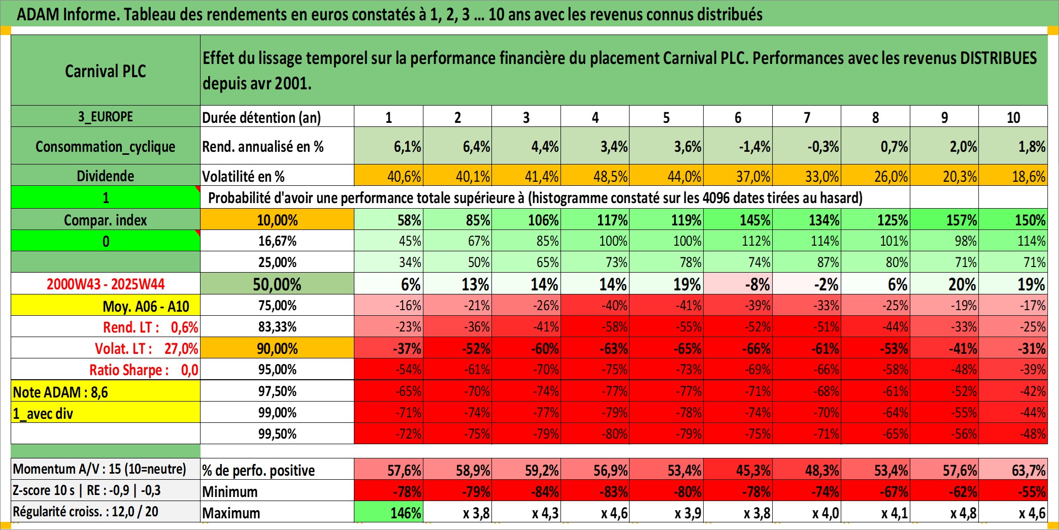 Site dédié aux investisseursPage dédiée sur site financeAnalyse des valorisations hebdomadaires de l'action Carnival PLC. Cet actif est cote en GBX. Les valorisations sont en contrevaleur EURO et couvrent les semaines 2000W43 a 2025W44. Les revenus de cet actif financier sont pris en compte depuis la semaine 2001W14. La note globale ESG de cet actif est estimee a 8.0 (apres rebasage entre 0 et 20).
