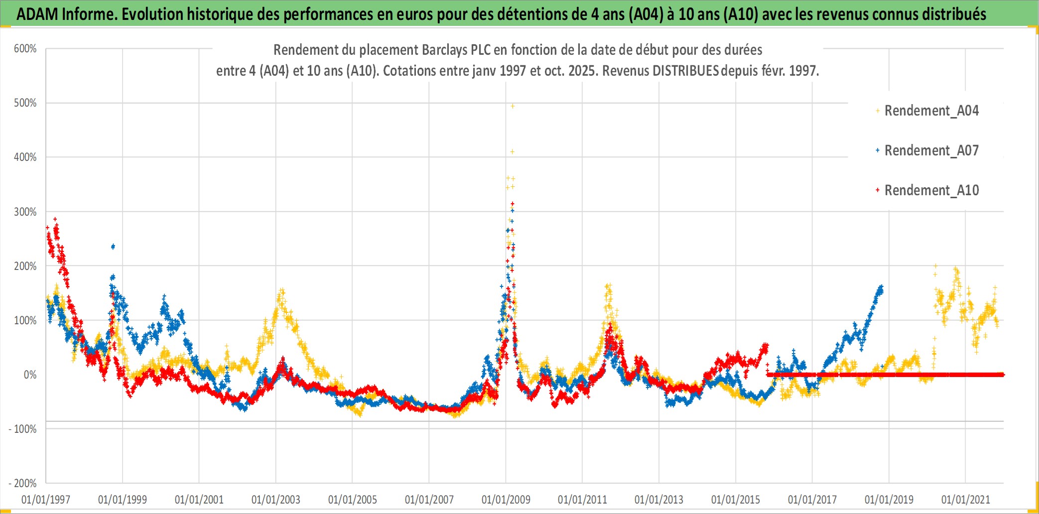 Site dédié aux investisseursPage dédiée sur site financeAnalyse des valorisations hebdomadaires de l'action Barclays PLC. Cet actif est cote en GBX. Les valorisations sont en contrevaleur EURO et couvrent les semaines 1997W01 a 2025W44. Les revenus de cet actif financier sont pris en compte depuis la semaine 1997W09. La note globale ESG de cet actif est estimee a 8.0 (apres rebasage entre 0 et 20).