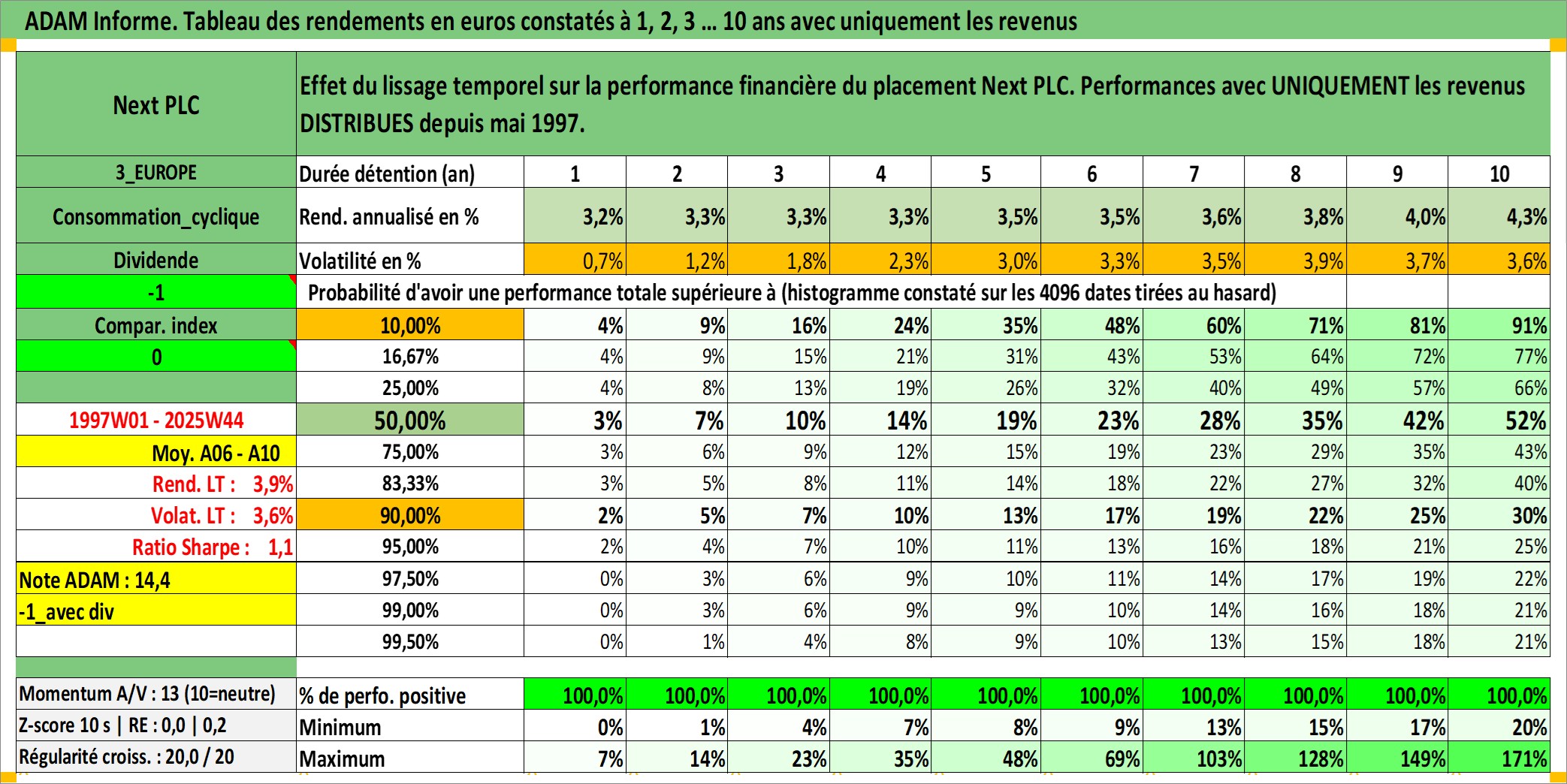 Site dédié aux investisseursPage dédiée sur site financeAnalyse des valorisations hebdomadaires de l'action Next PLC. Cet actif est cote en GBX. Les valorisations sont en contrevaleur EURO et couvrent les semaines 1997W01 a 2025W44. Les revenus de cet actif financier sont pris en compte depuis la semaine 1997W22. La note globale ESG de cet actif est estimee a 13.0 (apres rebasage entre 0 et 20).