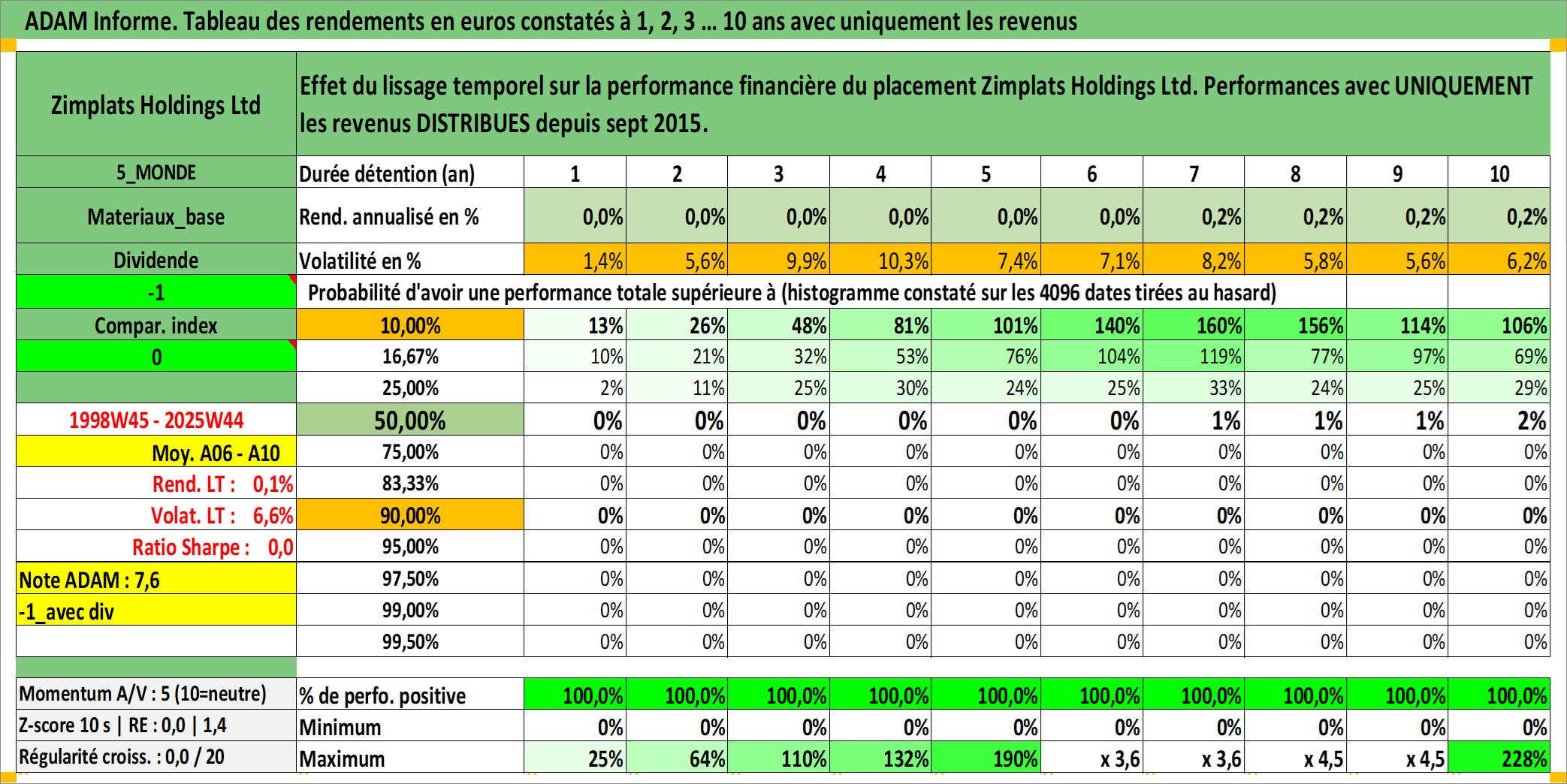 Site dédié aux investisseursPage dédiée sur site financeAnalyse des valorisations hebdomadaires de l'action Zimplats Holdings Ltd. Cet actif est cote en AUD. Les valorisations sont en contrevaleur EURO et couvrent les semaines 1998W45 a 2025W44. Les revenus de cet actif financier sont pris en compte depuis la semaine 2015W37. La note ESG de cet actif n'est pas connue.