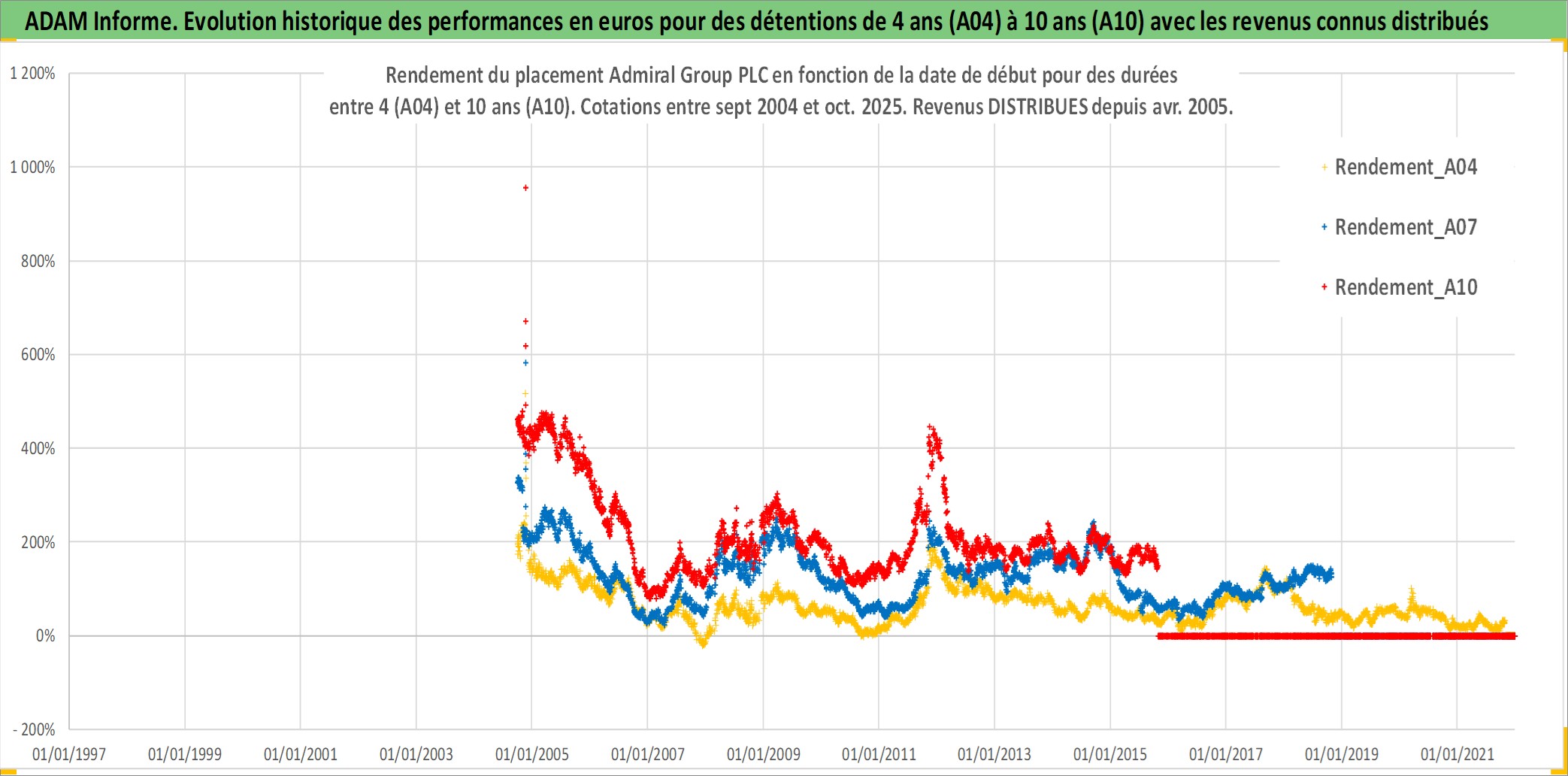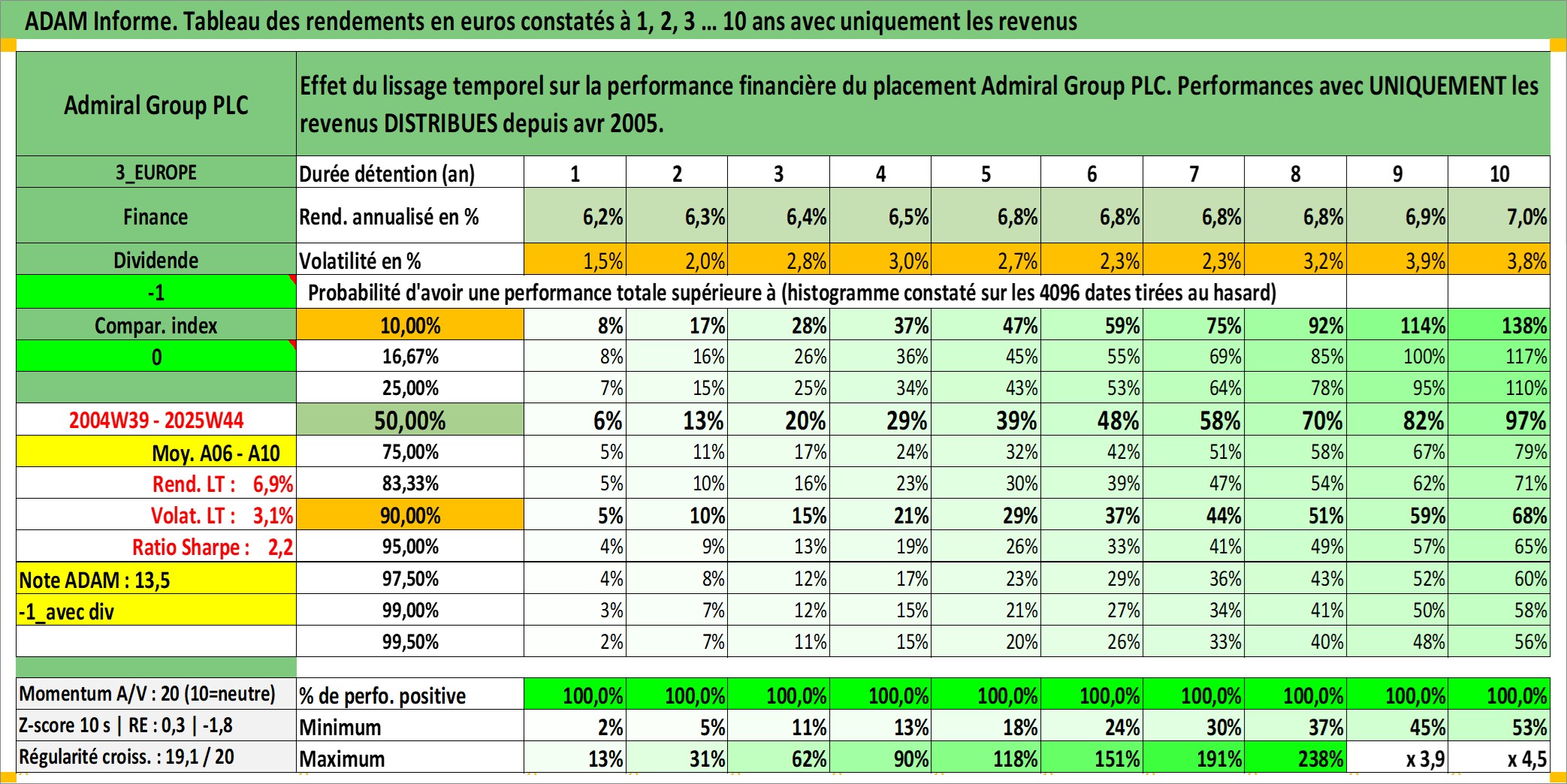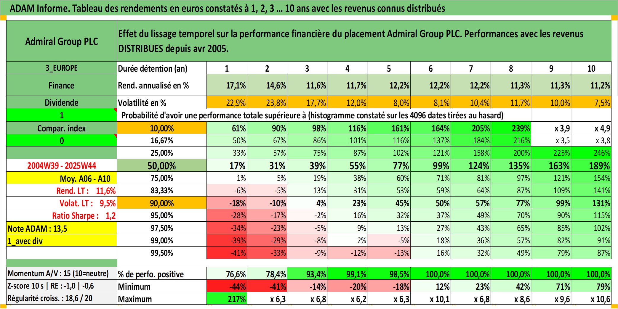 Site dédié aux investisseursPage dédiée sur site financeAnalyse des valorisations hebdomadaires de l'action Admiral Group PLC. Cet actif est cote en GBX. Les valorisations sont en contrevaleur EURO et couvrent les semaines 2004W39 a 2025W44. Les revenus de cet actif financier sont pris en compte depuis la semaine 2005W17. La note globale ESG de cet actif est estimee a 9.0 (apres rebasage entre 0 et 20).