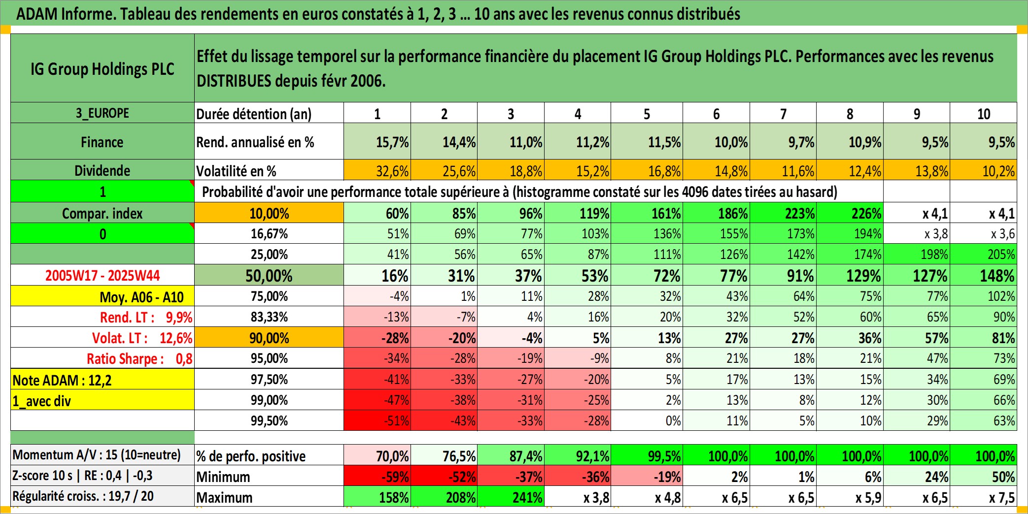 Site dédié aux investisseursPage dédiée sur site financeAnalyse des valorisations hebdomadaires de l'action IG Group Holdings PLC. Cet actif est cote en GBX. Les valorisations sont en contrevaleur EURO et couvrent les semaines 2005W17 a 2025W44. Les revenus de cet actif financier sont pris en compte depuis la semaine 2006W05. La note ESG de cet actif n'est pas connue.
