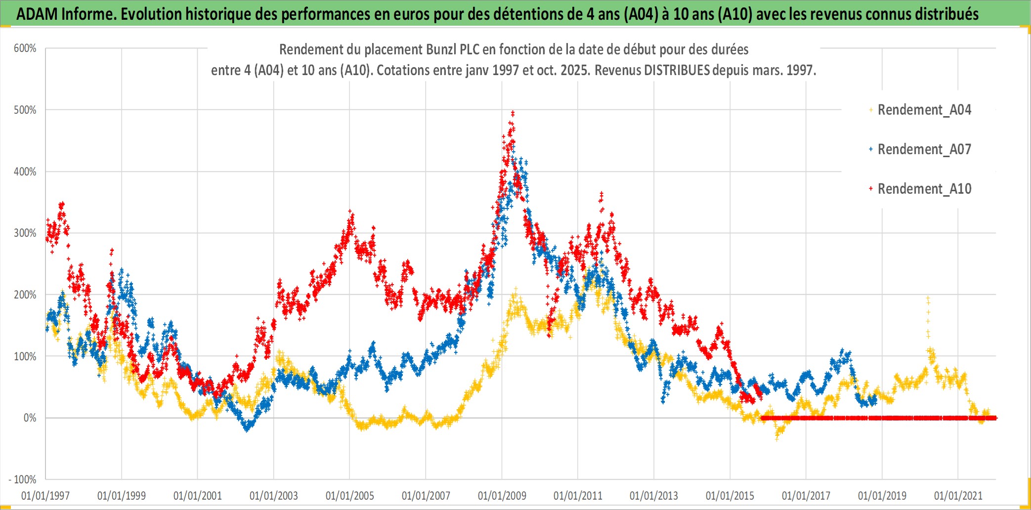 Site dédié aux investisseursPage dédiée sur site financeAnalyse des valorisations hebdomadaires de l'action Bunzl PLC. Cet actif est cote en GBX. Les valorisations sont en contrevaleur EURO et couvrent les semaines 1997W01 a 2025W44. Les revenus de cet actif financier sont pris en compte depuis la semaine 1997W13. La note globale ESG de cet actif est estimee a 13.0 (apres rebasage entre 0 et 20).
