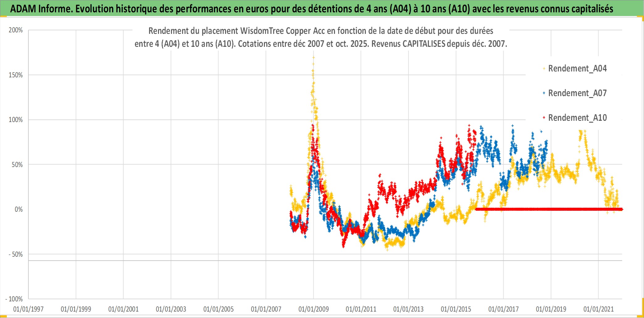 Site dédié aux investisseursPage dédiée sur site financeAnalyse des valorisations hebdomadaires du fonds WisdomTree Copper Acc. Cet actif est cote en USD. Les valorisations sont en contrevaleur EURO et couvrent les semaines 2008W01 a 2025W44. Les revenus de cet actif financier sont pris en compte depuis la semaine 2008W01. La note ESG de cet actif n'est pas connue.