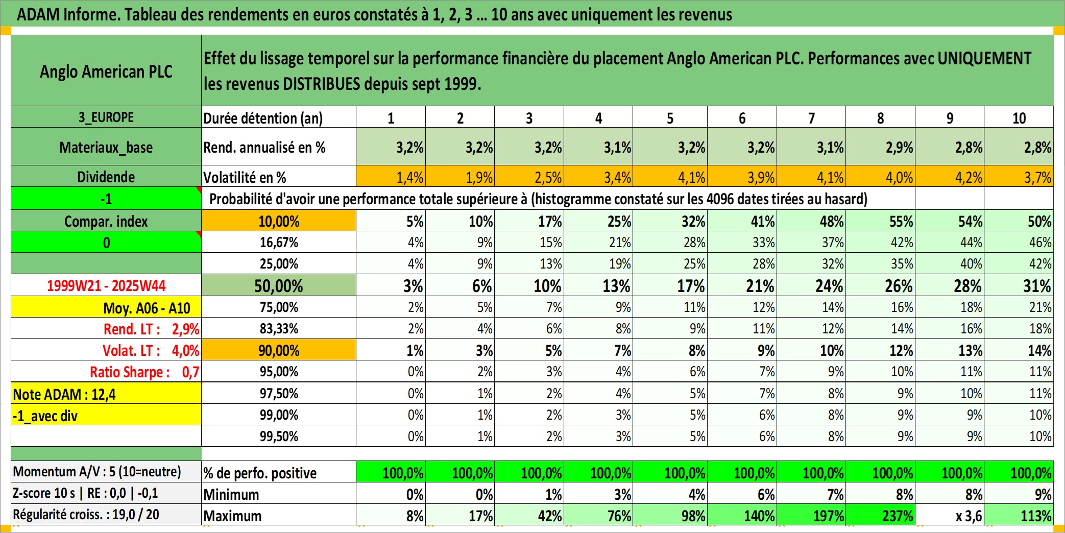 Site dédié aux investisseursPage dédiée sur site financeAnalyse des valorisations hebdomadaires de l'action Anglo American PLC. Cet actif est cote en GBX. Les valorisations sont en contrevaleur EURO et couvrent les semaines 1999W21 a 2025W44. Les revenus de cet actif financier sont pris en compte depuis la semaine 1999W38. La note globale ESG de cet actif est estimee a 9.0 (apres rebasage entre 0 et 20).