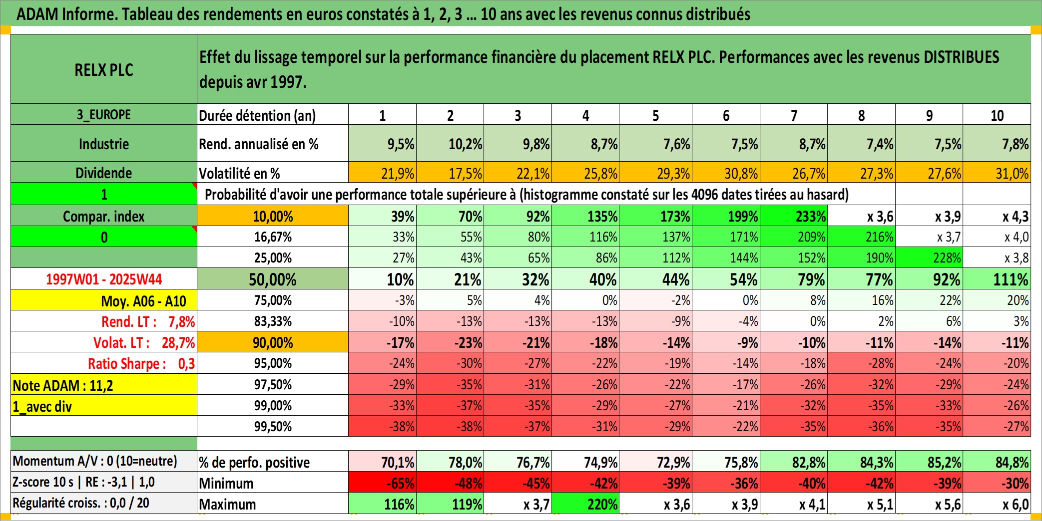 Site dédié aux investisseursPage dédiée sur site financeAnalyse des valorisations hebdomadaires de l'action RELX PLC. Cet actif est cote en GBX. Les valorisations sont en contrevaleur EURO et couvrent les semaines 1997W01 a 2025W44. Les revenus de cet actif financier sont pris en compte depuis la semaine 1997W17. La note globale ESG de cet actif est estimee a 20.0 (apres rebasage entre 0 et 20).