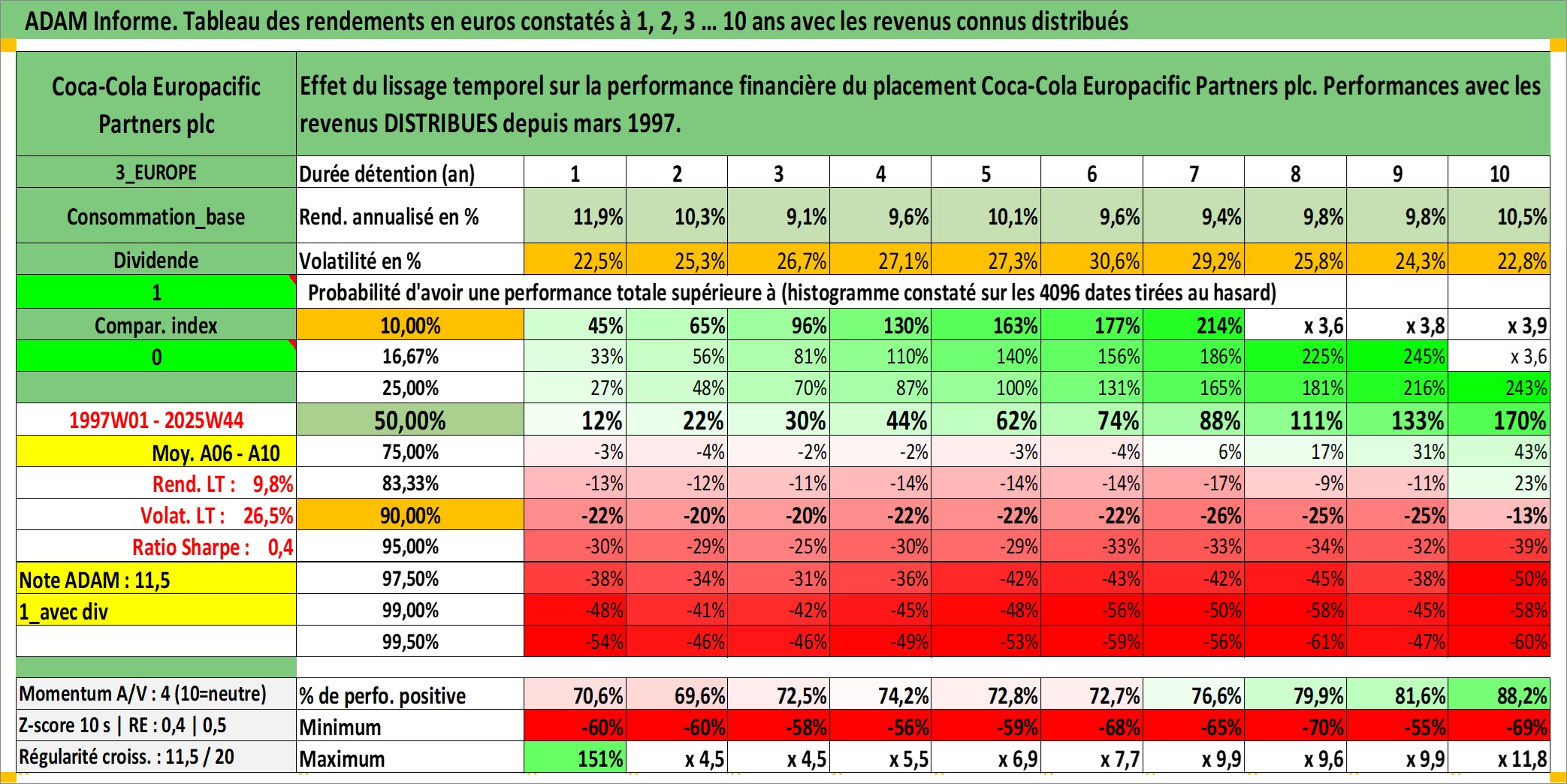 Site dédié aux investisseursPage dédiée sur site financeAnalyse des valorisations hebdomadaires de l'action Coca-Cola Europacific Partners plc. Cet actif est cote en USD. Les valorisations sont en contrevaleur EURO et couvrent les semaines 1997W01 a 2025W44. Les revenus de cet actif financier sont pris en compte depuis la semaine 1997W12. La note ESG de cet actif n'est pas connue.