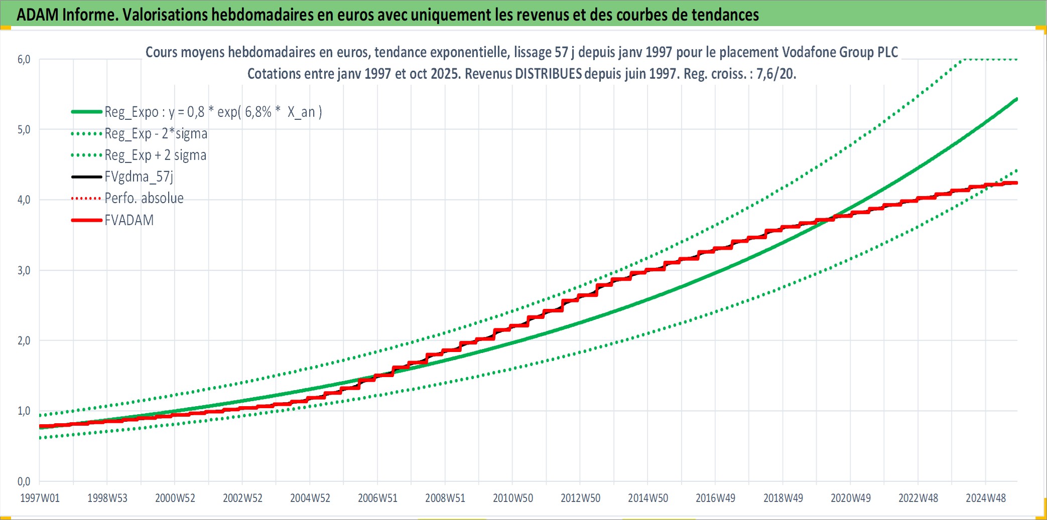 Site dédié aux investisseursPage dédiée sur site financeAnalyse des valorisations hebdomadaires de l'action Vodafone Group PLC. Cet actif est cote en GBX. Les valorisations sont en contrevaleur EURO et couvrent les semaines 1997W01 a 2025W44. Les revenus de cet actif financier sont pris en compte depuis la semaine 1997W24. La note globale ESG de cet actif est estimee a 13.0 (apres rebasage entre 0 et 20).