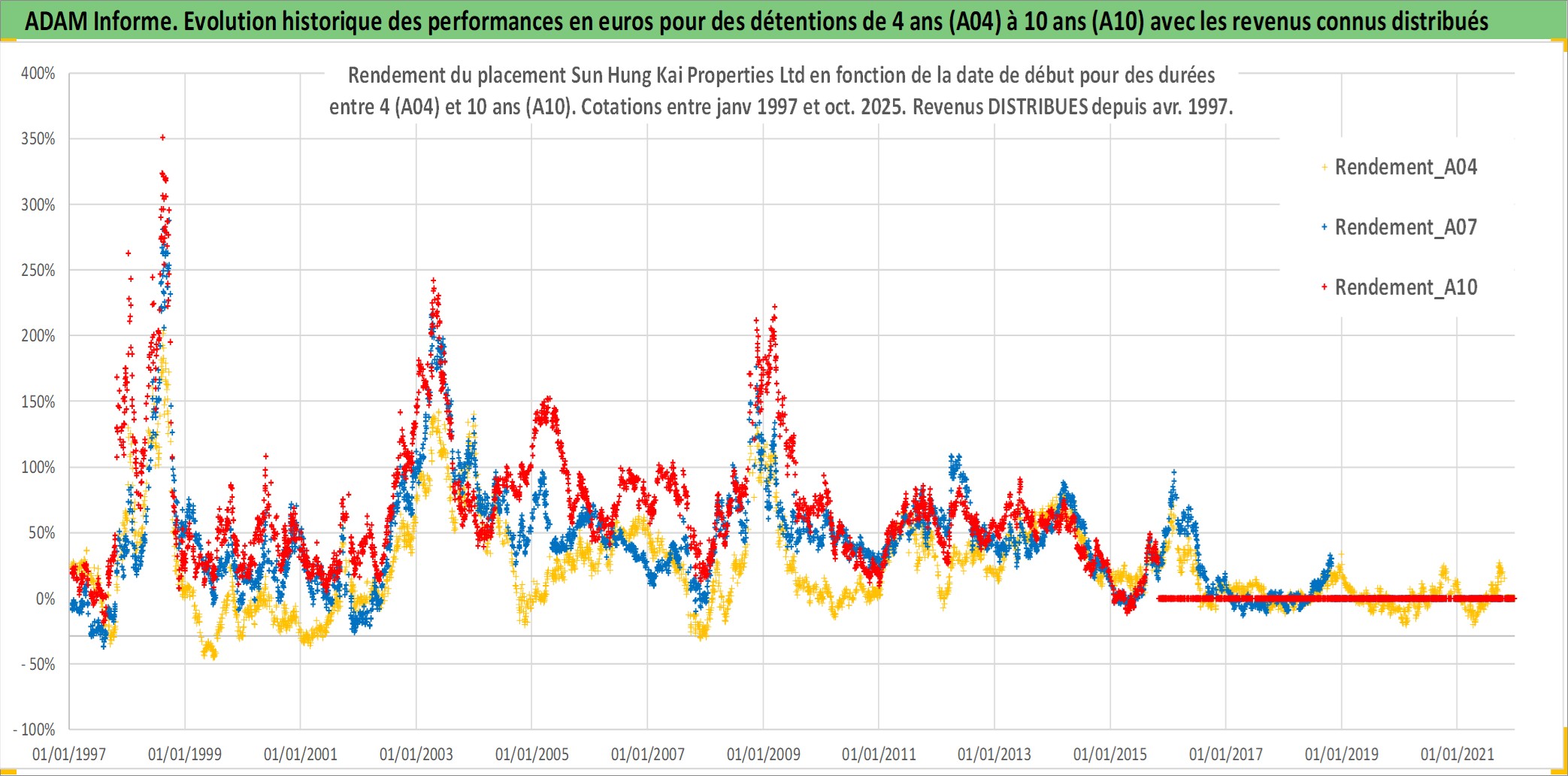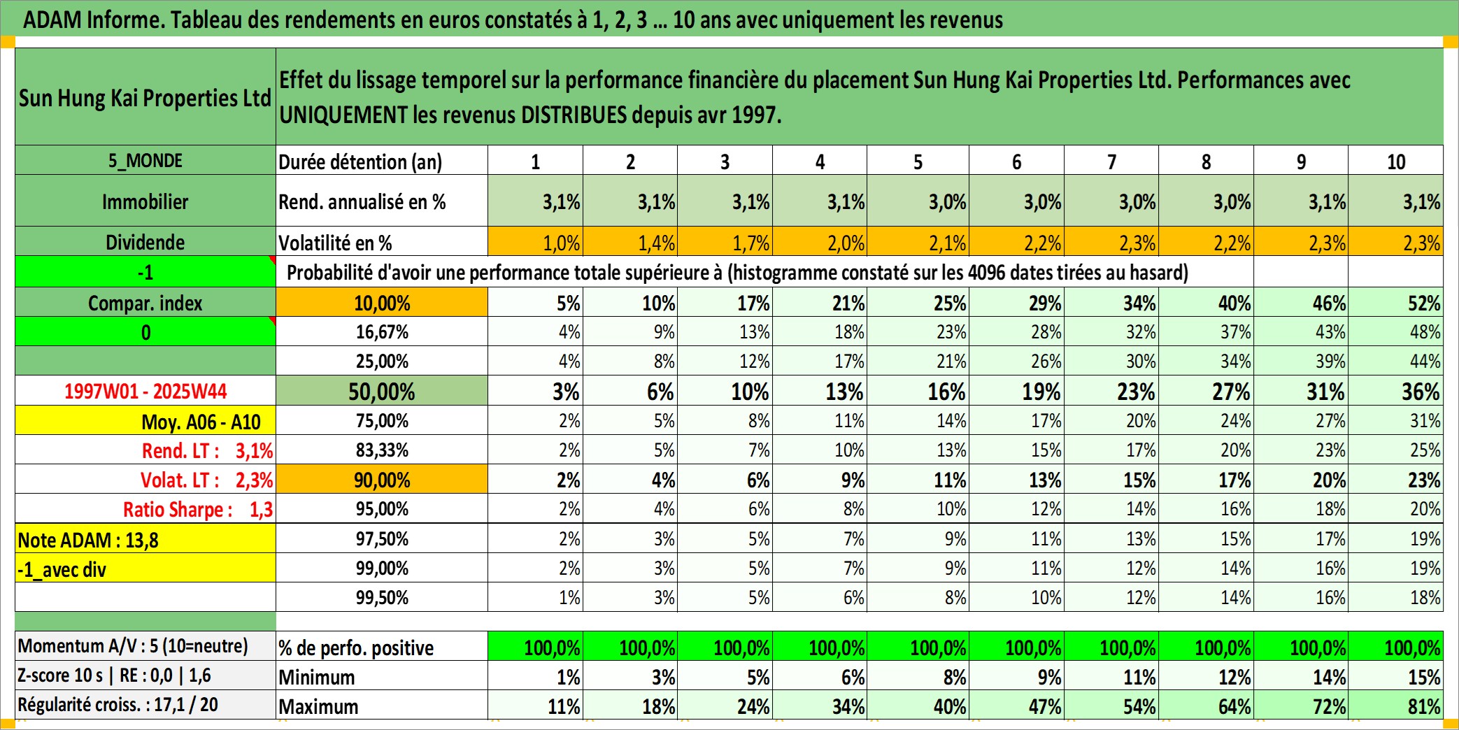 Site dédié aux investisseursPage dédiée sur site financeAnalyse des valorisations hebdomadaires de l'action Sun Hung Kai Properties Ltd. Cet actif est cote en HKD. Les valorisations sont en contrevaleur EURO et couvrent les semaines 1997W01 a 2025W44. Les revenus de cet actif financier sont pris en compte depuis la semaine 1997W15. La note globale ESG de cet actif est estimee a 11.0 (apres rebasage entre 0 et 20).