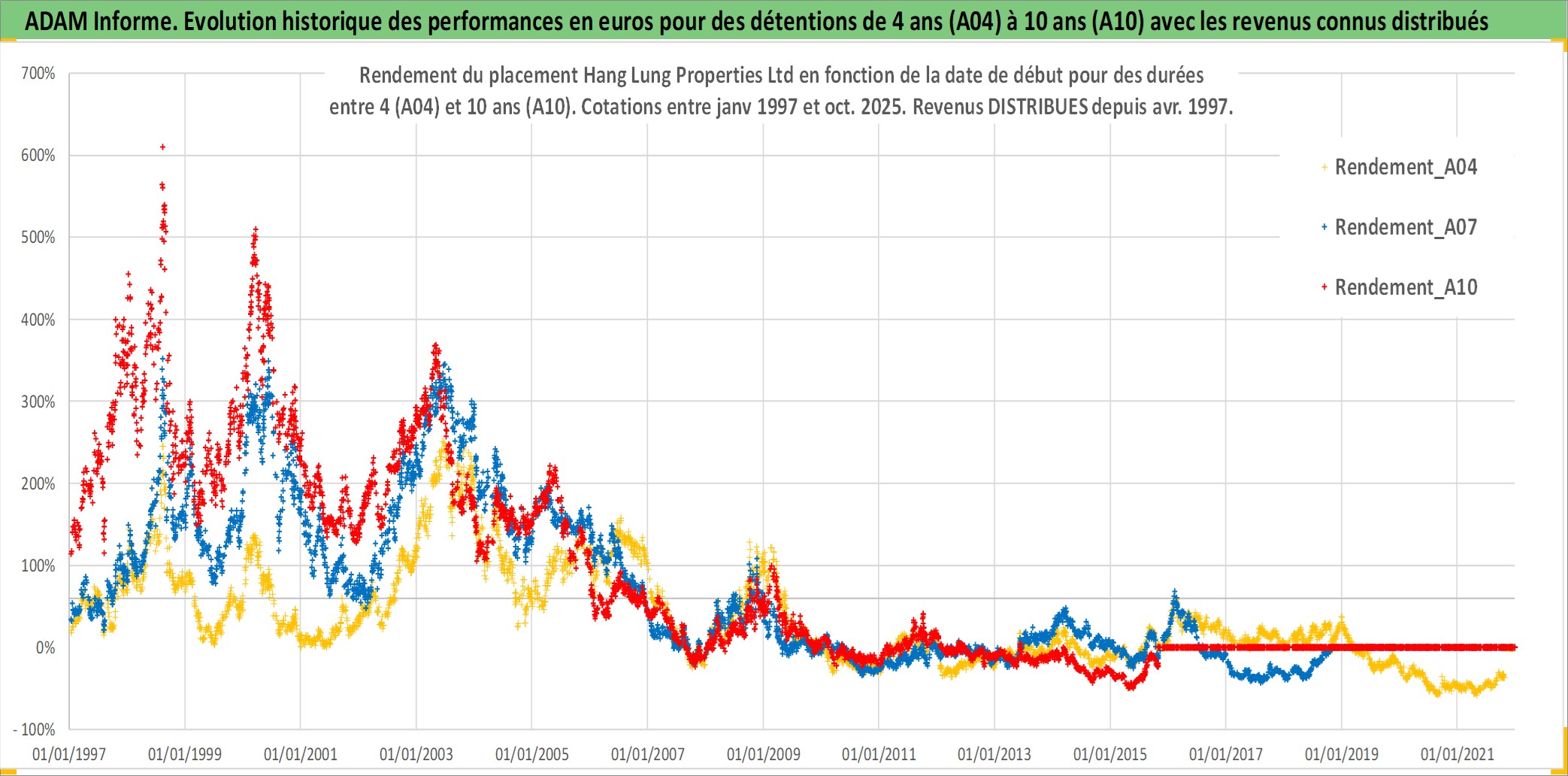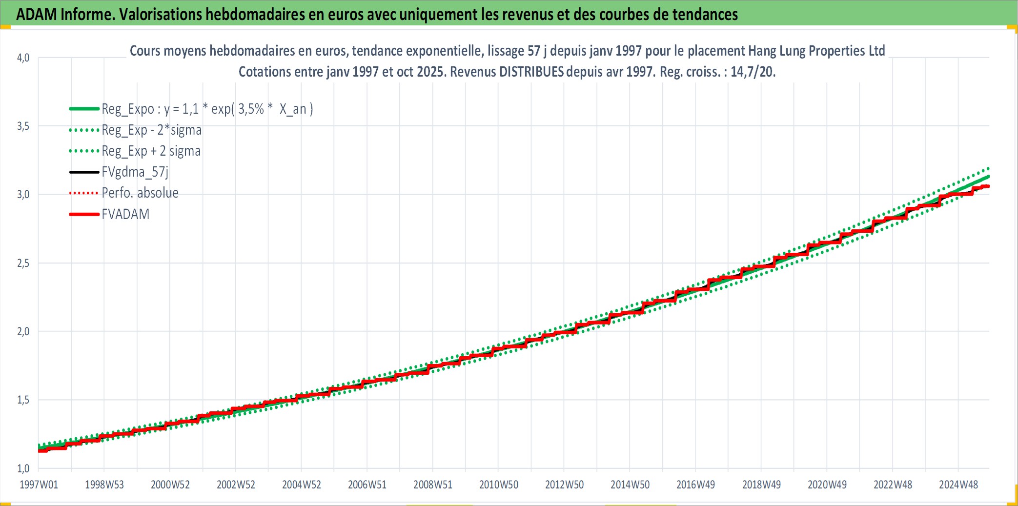 Site dédié aux investisseursPage dédiée sur site financeAnalyse des valorisations hebdomadaires de l'action Hang Lung Properties Ltd. Cet actif est cote en HKD. Les valorisations sont en contrevaleur EURO et couvrent les semaines 1997W01 a 2025W44. Les revenus de cet actif financier sont pris en compte depuis la semaine 1997W15. La note globale ESG de cet actif est estimee a 13.0 (apres rebasage entre 0 et 20).