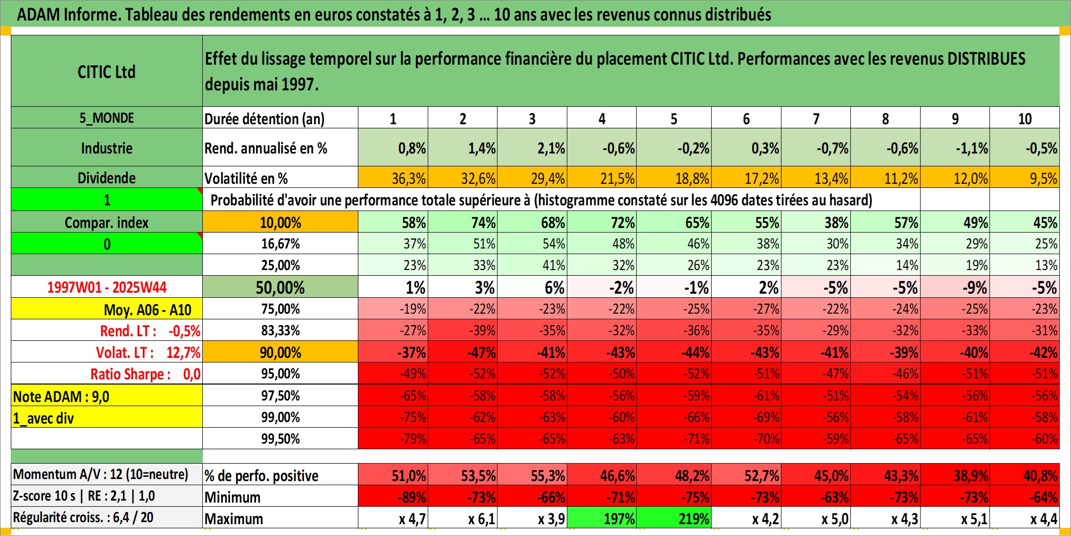 Site dédié aux investisseursPage dédiée sur site financeAnalyse des valorisations hebdomadaires de l'action CITIC Ltd. Cet actif est cote en HKD. Les valorisations sont en contrevaleur EURO et couvrent les semaines 1997W01 a 2025W44. Les revenus de cet actif financier sont pris en compte depuis la semaine 1997W22. La note ESG de cet actif n'est pas connue.