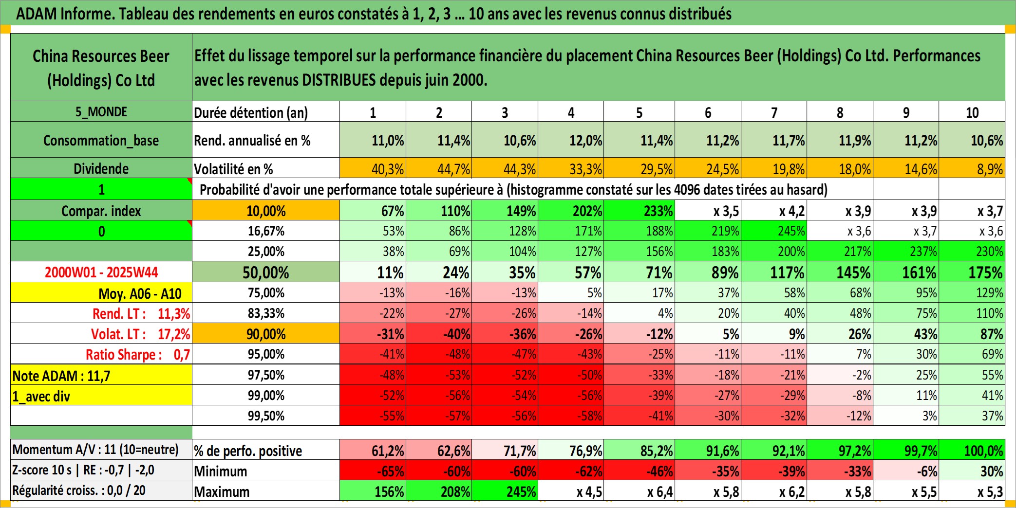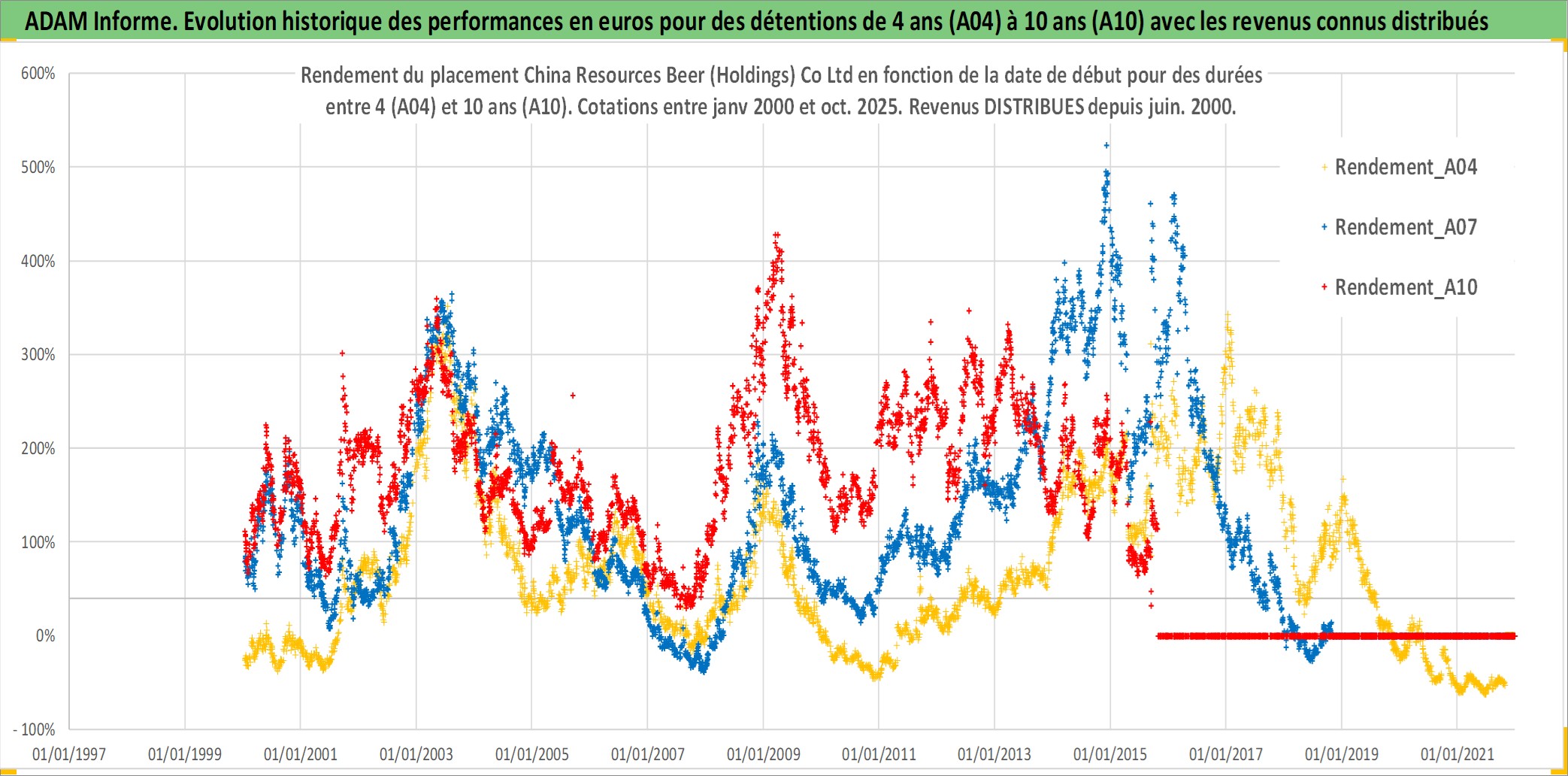 Site dédié aux investisseursPage dédiée sur site financeAnalyse des valorisations hebdomadaires de l'action China Resources Beer (Holdings) Co Ltd. Cet actif est cote en HKD. Les valorisations sont en contrevaleur EURO et couvrent les semaines 2000W01 a 2025W44. Les revenus de cet actif financier sont pris en compte depuis la semaine 2000W23. La note globale ESG de cet actif est estimee a 5.0 (apres rebasage entre 0 et 20).