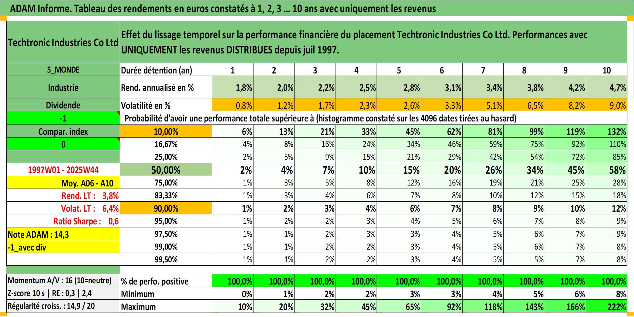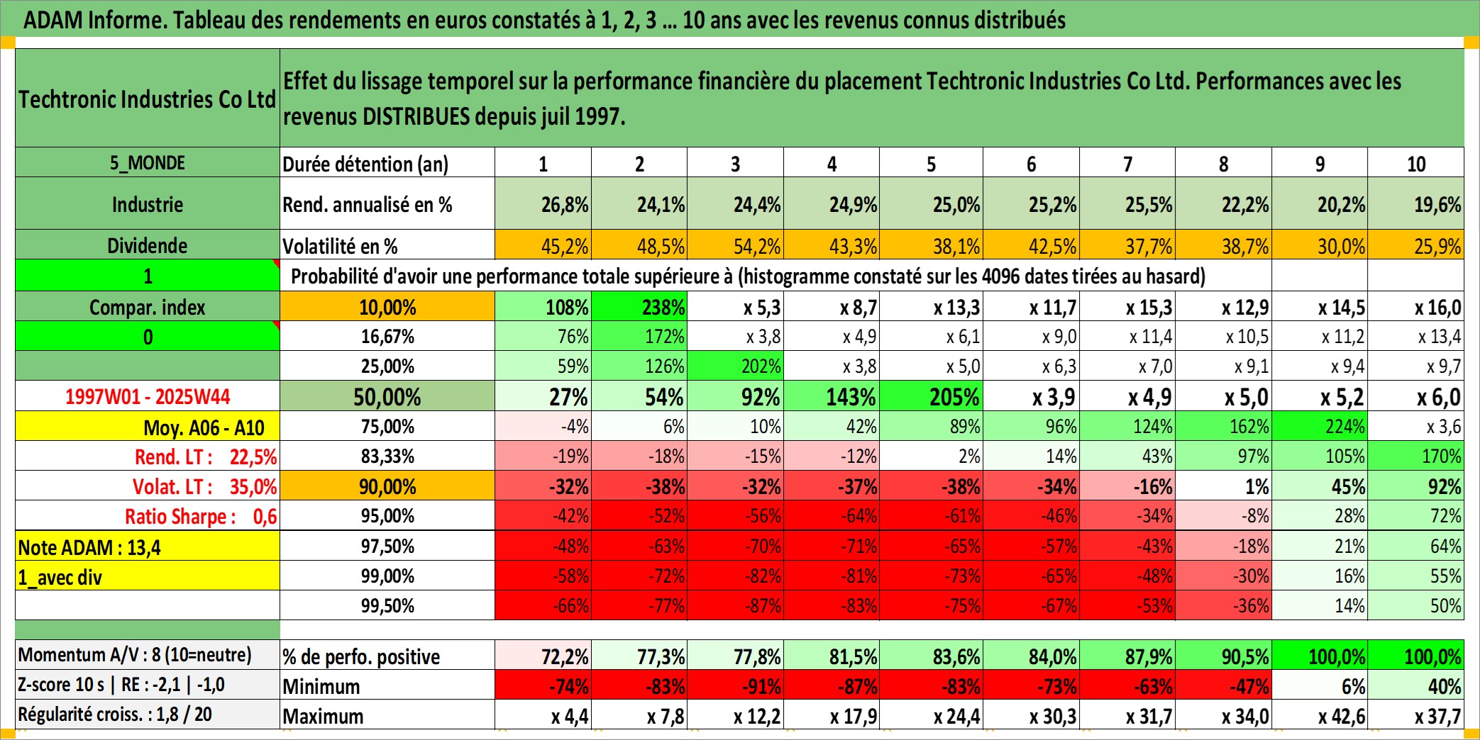 Site dédié aux investisseursPage dédiée sur site financeAnalyse des valorisations hebdomadaires de l'action Techtronic Industries Co Ltd. Cet actif est cote en HKD. Les valorisations sont en contrevaleur EURO et couvrent les semaines 1997W01 a 2025W44. Les revenus de cet actif financier sont pris en compte depuis la semaine 1997W28. La note globale ESG de cet actif est estimee a 9.0 (apres rebasage entre 0 et 20).