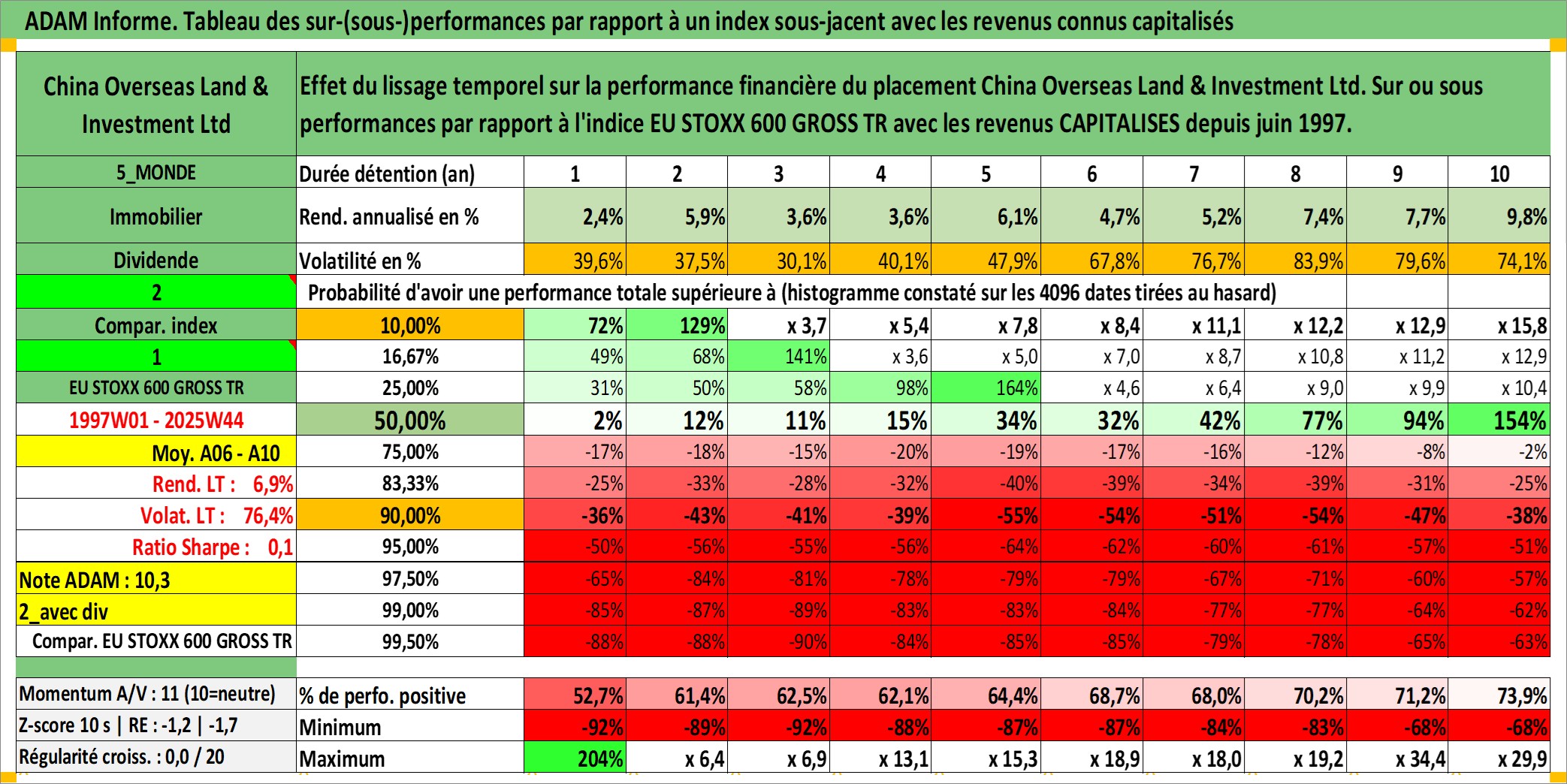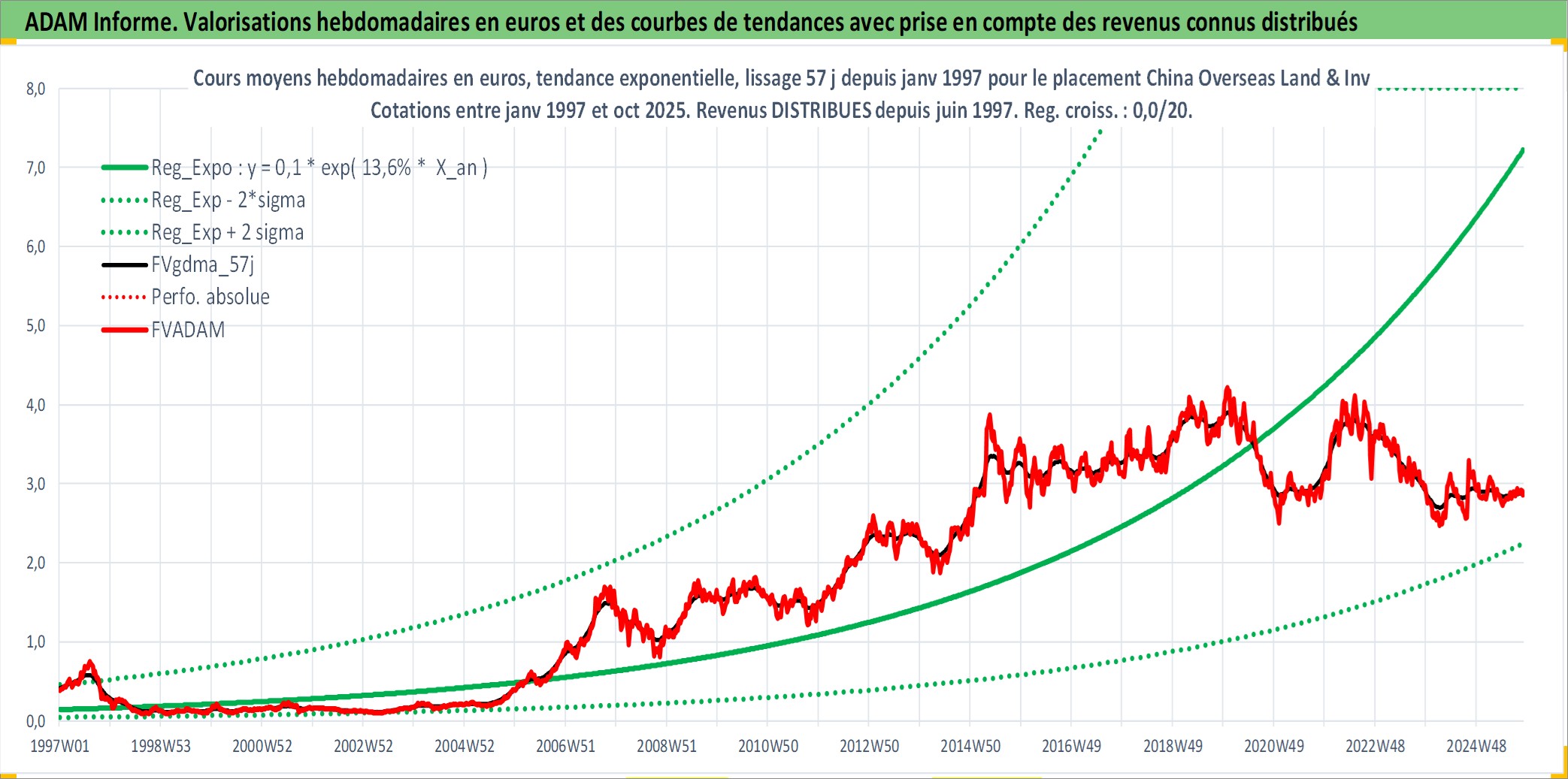 Site dédié aux investisseursPage dédiée sur site financeAnalyse des valorisations hebdomadaires de l'action China Overseas Land & Investment Ltd. Cet actif est cote en HKD. Les valorisations sont en contrevaleur EURO et couvrent les semaines 1997W01 a 2025W44. Les revenus de cet actif financier sont pris en compte depuis la semaine 1997W24. La note globale ESG de cet actif est estimee a 13.0 (apres rebasage entre 0 et 20).