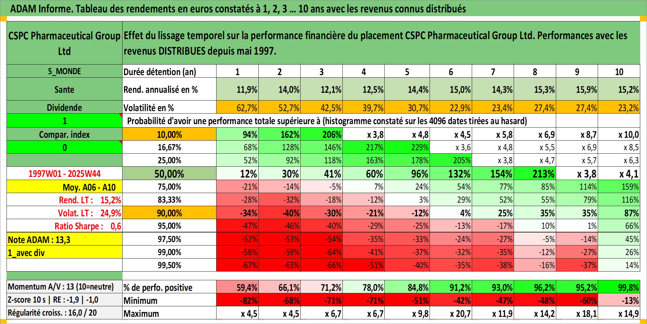 Site dédié aux investisseursPage dédiée sur site financeAnalyse des valorisations hebdomadaires de l'action CSPC Pharmaceutical Group Ltd. Cet actif est cote en HKD. Les valorisations sont en contrevaleur EURO et couvrent les semaines 1997W01 a 2025W44. Les revenus de cet actif financier sont pris en compte depuis la semaine 1997W22. La note globale ESG de cet actif est estimee a 4.0 (apres rebasage entre 0 et 20).