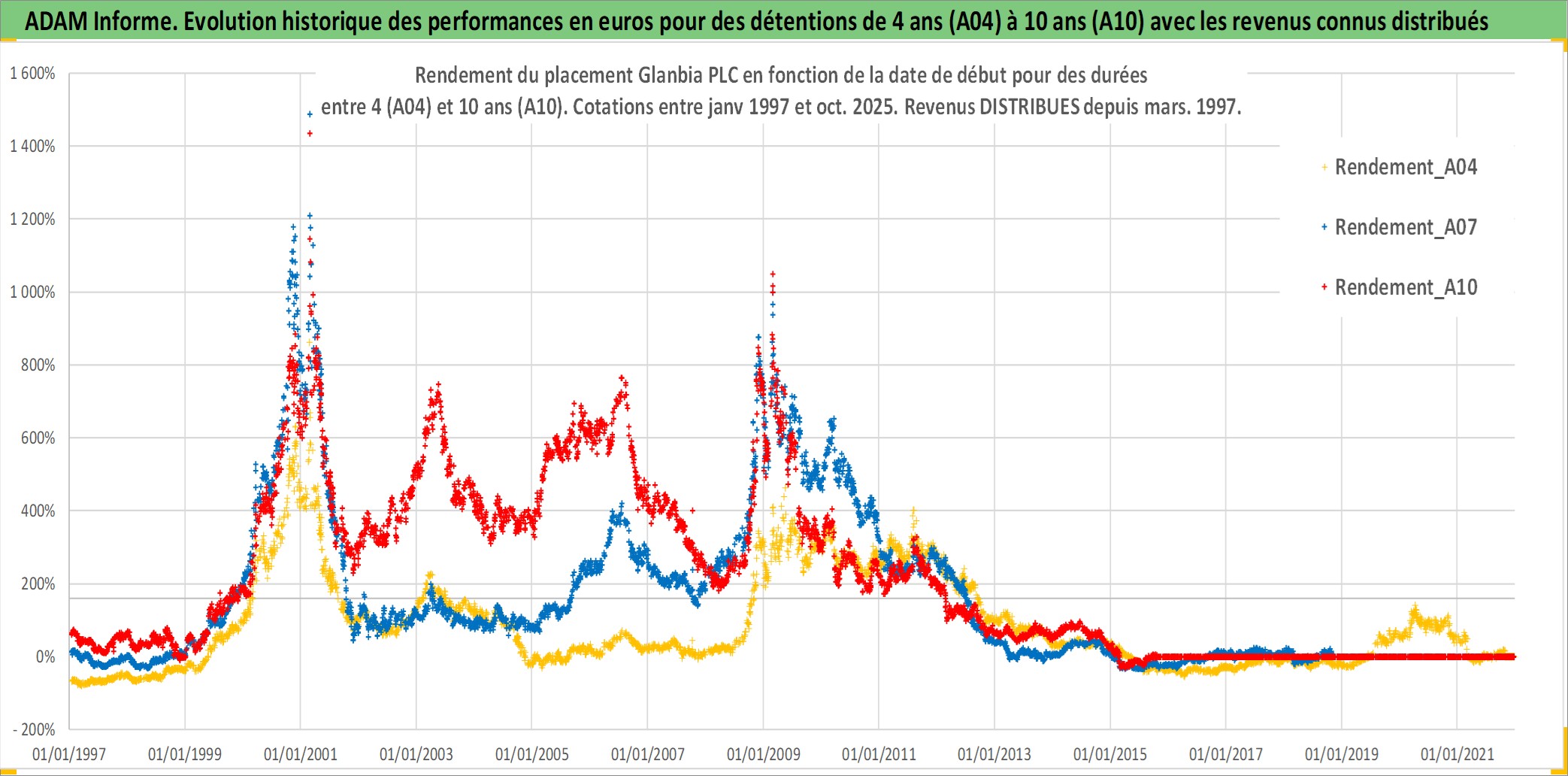 Site dédié aux investisseursPage dédiée sur site financeAnalyse des valorisations hebdomadaires de l'action Glanbia PLC. Cet actif est cote en EUR. Les valorisations couvrent les semaines 1997W01 a 2025W44. Les revenus de cet actif financier sont pris en compte depuis la semaine 1997W11. La note globale ESG de cet actif est estimee a 3.0 (apres rebasage entre 0 et 20).
