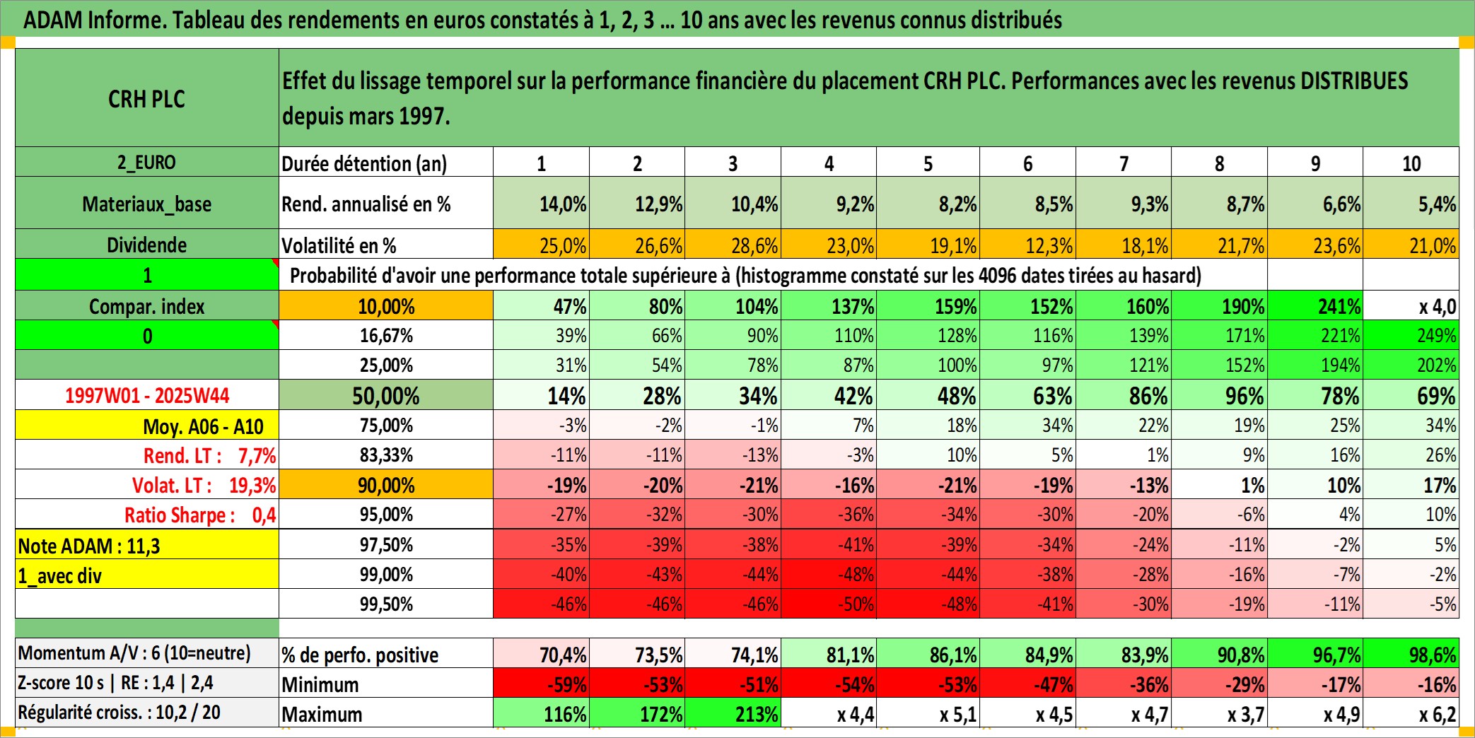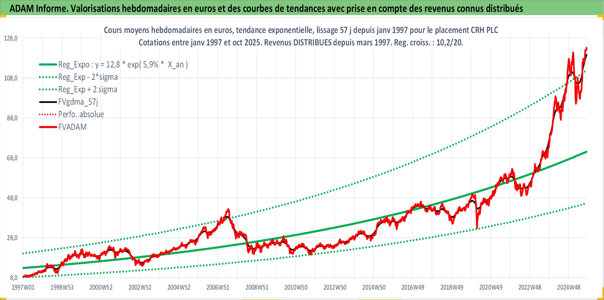 Site dédié aux investisseursPage dédiée sur site financeAnalyse des valorisations hebdomadaires de l'action CRH PLC. Cet actif est cote en USD. Les valorisations sont en contrevaleur EURO et couvrent les semaines 1997W01 a 2025W44. Les revenus de cet actif financier sont pris en compte depuis la semaine 1997W11. La note ESG de cet actif n'est pas connue.