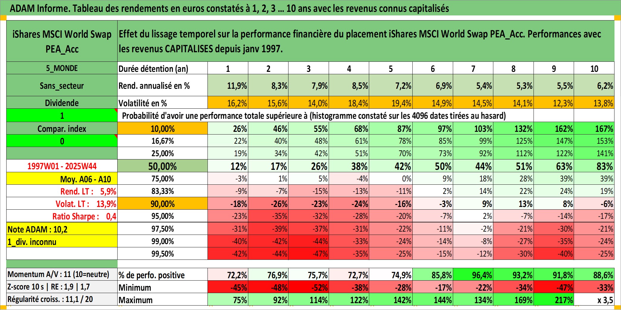 Site dédié aux investisseursPage dédiée sur site financeAnalyse des valorisations hebdomadaires du fonds iShares MSCI World Swap PEA_Acc. Cet actif est cote en EUR. Les valorisations couvrent les semaines 1997W01 a 2025W44. Les revenus de cet actif financier sont pris en compte depuis la semaine 1997W01. La note ESG de cet actif n'est pas connue.