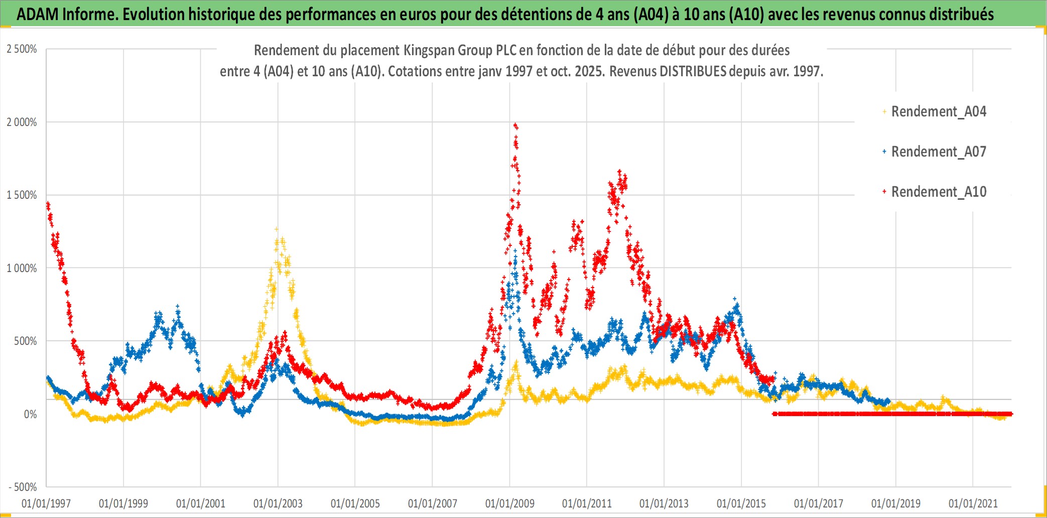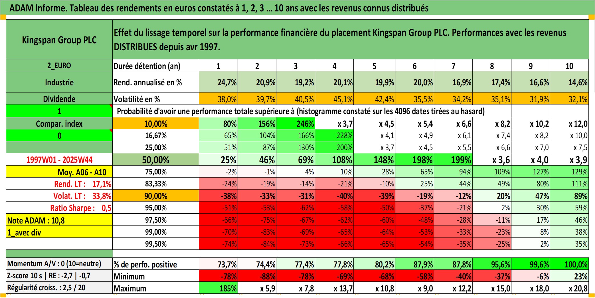 Site dédié aux investisseursPage dédiée sur site financeAnalyse des valorisations hebdomadaires de l'action Kingspan Group PLC. Cet actif est cote en EUR. Les valorisations couvrent les semaines 1997W01 a 2025W44. Les revenus de cet actif financier sont pris en compte depuis la semaine 1997W18. La note ESG de cet actif n'est pas connue.