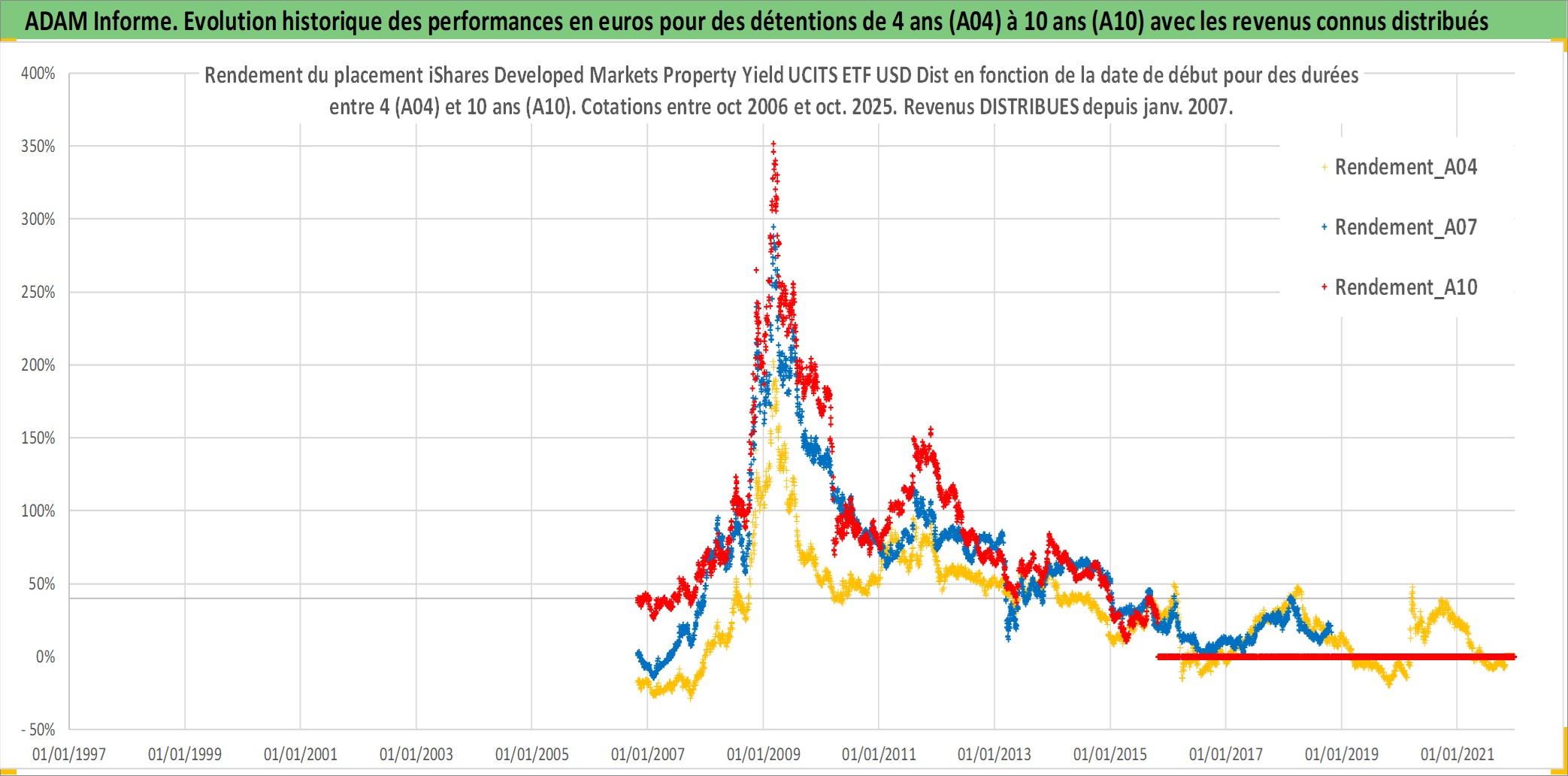Site dédié aux investisseursPage dédiée sur site financeAnalyse des valorisations hebdomadaires du fonds iShares Developed Markets Property Yield UCITS ETF USD Dist. Cet actif est cote en USD. Les valorisations sont en contrevaleur EURO et couvrent les semaines 2006W42 a 2025W44. Les revenus de cet actif financier sont pris en compte depuis la semaine 2007W05. La note ESG de cet actif n'est pas connue.