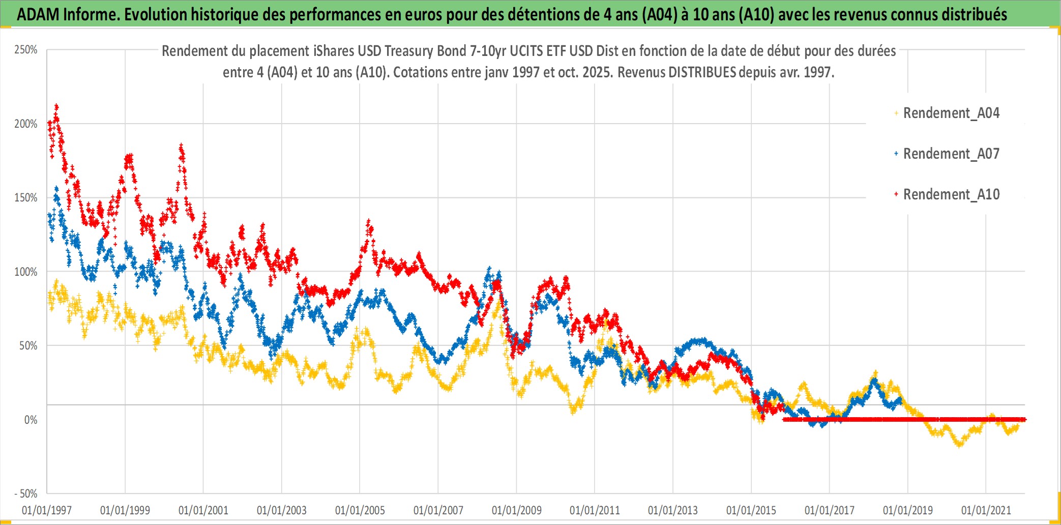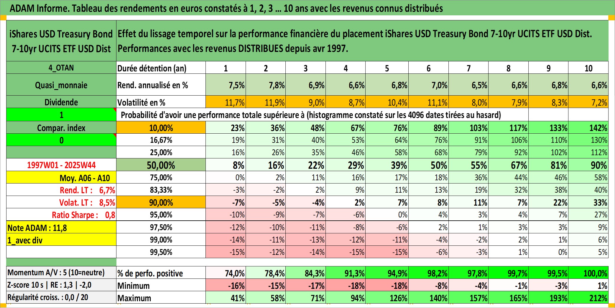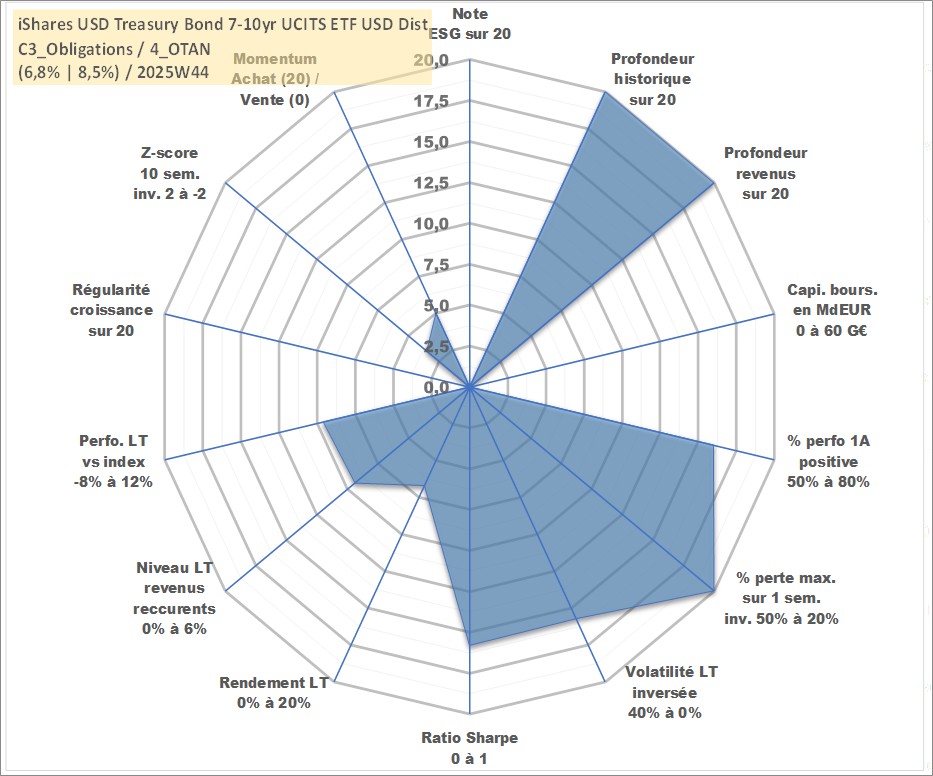 Site dédié aux investisseursPage dédiée sur site financeAnalyse des valorisations hebdomadaires du fonds iShares USD Treasury Bond 7-10yr UCITS ETF USD Dist. Cet actif est cote en USD. Les valorisations sont en contrevaleur EURO et couvrent les semaines 1997W01 a 2025W44. Les revenus de cet actif financier sont pris en compte depuis la semaine 1997W17. La note ESG de cet actif n'est pas connue.