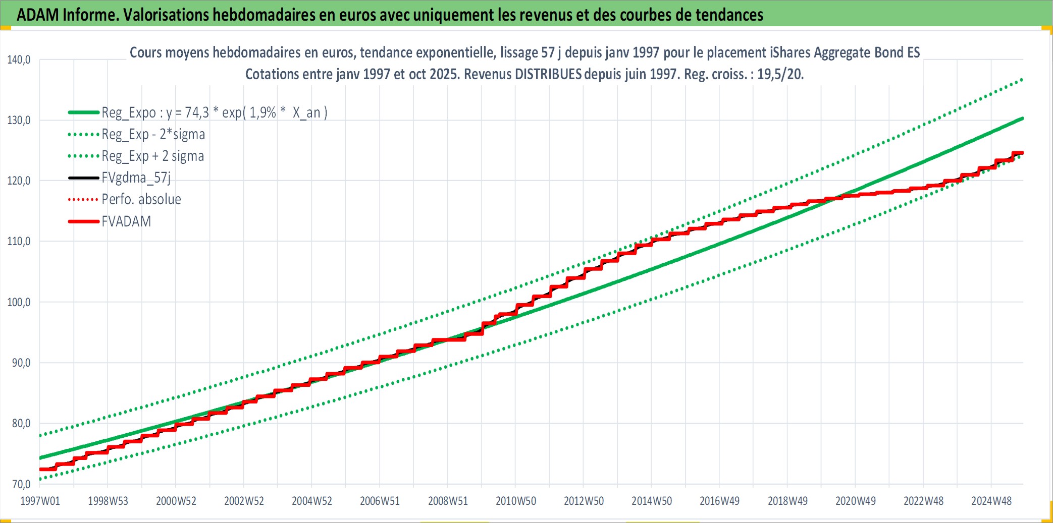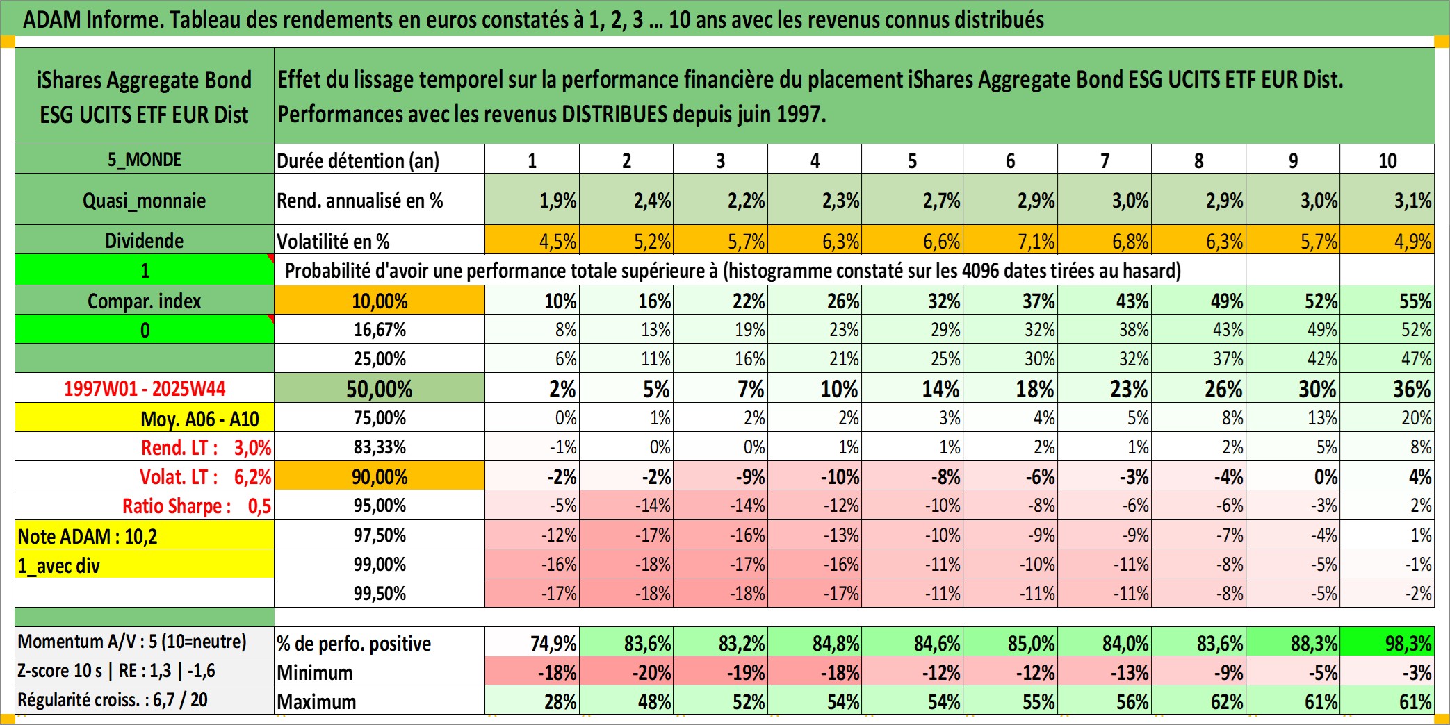 Site dédié aux investisseursPage dédiée sur site financeAnalyse des valorisations hebdomadaires du fonds iShares Aggregate Bond ESG UCITS ETF EUR Dist. Cet actif est cote en EUR. Les valorisations couvrent les semaines 1997W01 a 2025W44. Les revenus de cet actif financier sont pris en compte depuis la semaine 1997W26. La note ESG de cet actif n'est pas connue.