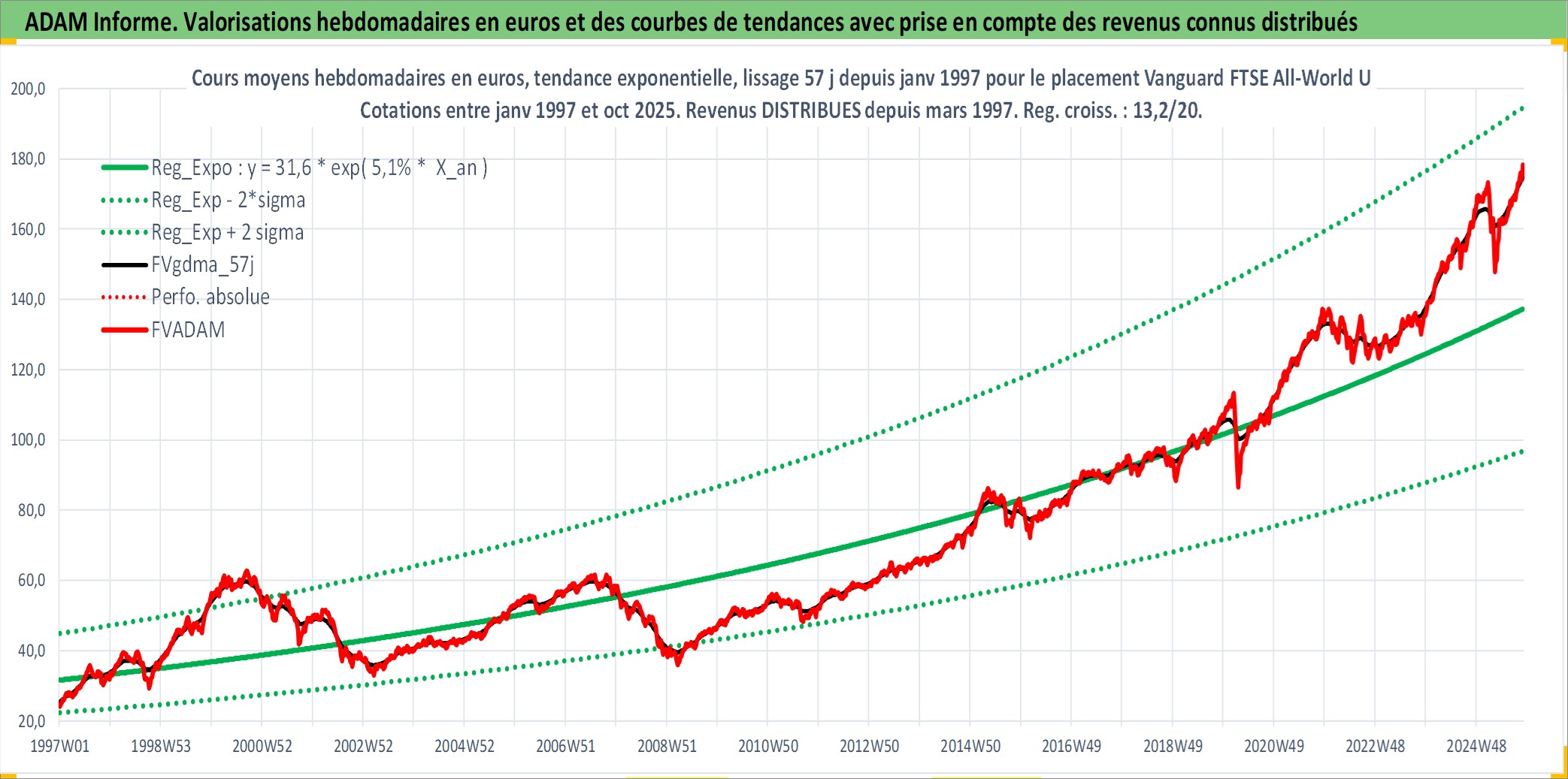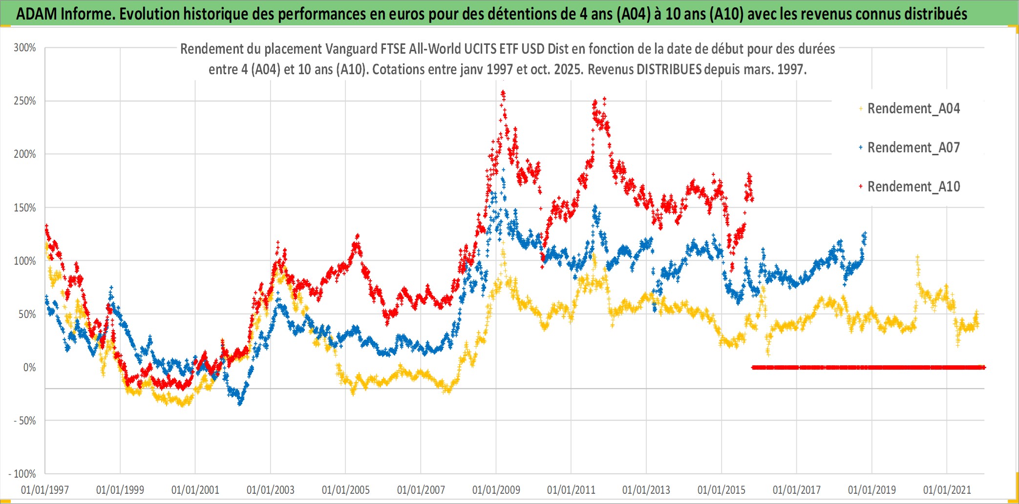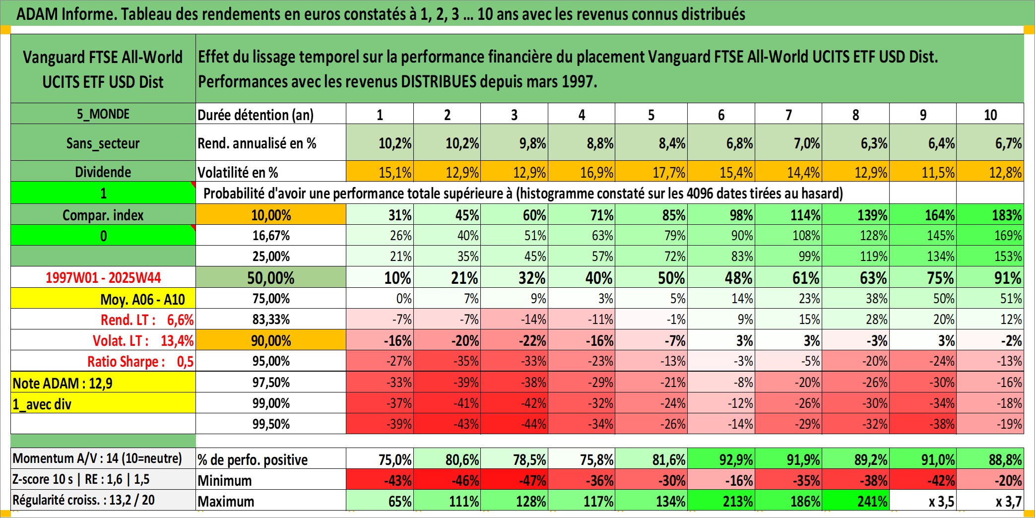 Site dédié aux investisseursPage dédiée sur site financeAnalyse des valorisations hebdomadaires du fonds Vanguard FTSE All-World UCITS ETF USD Dist. Cet actif est cote en USD. Les valorisations sont en contrevaleur EURO et couvrent les semaines 1997W01 a 2025W44. Les revenus de cet actif financier sont pris en compte depuis la semaine 1997W13. La note ESG de cet actif n'est pas connue.