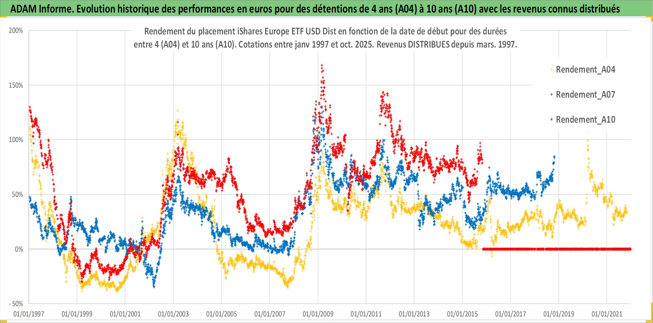 Site dédié aux investisseursPage dédiée sur site financeAnalyse des valorisations hebdomadaires du fonds iShares Europe ETF USD Dist. Cet actif est cote en USD. Les valorisations sont en contrevaleur EURO et couvrent les semaines 1997W01 a 2025W44. Les revenus de cet actif financier sont pris en compte depuis la semaine 1997W11. La note ESG de cet actif n'est pas connue.