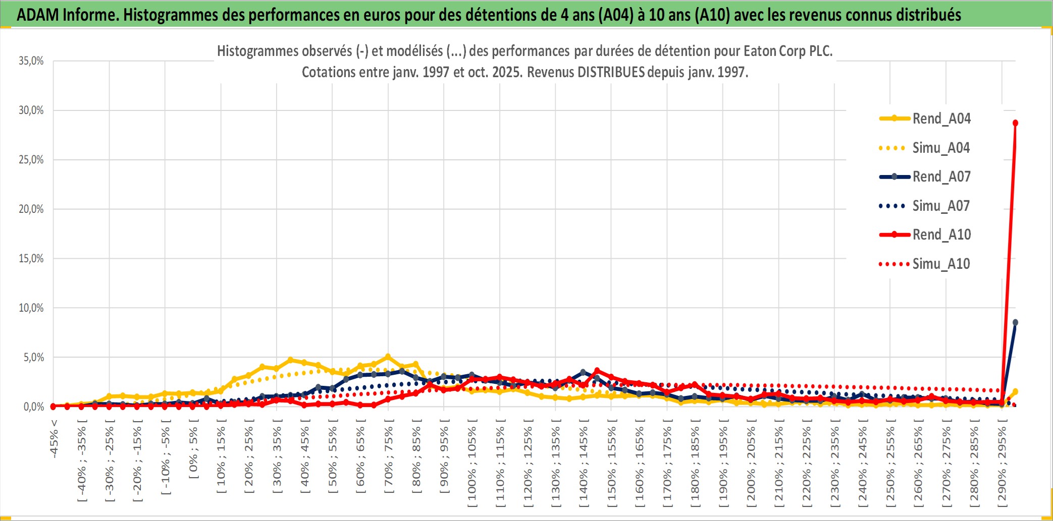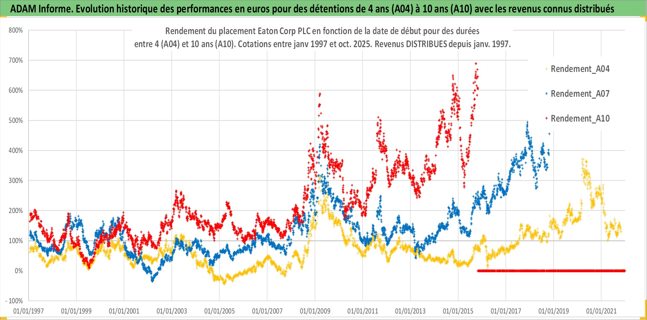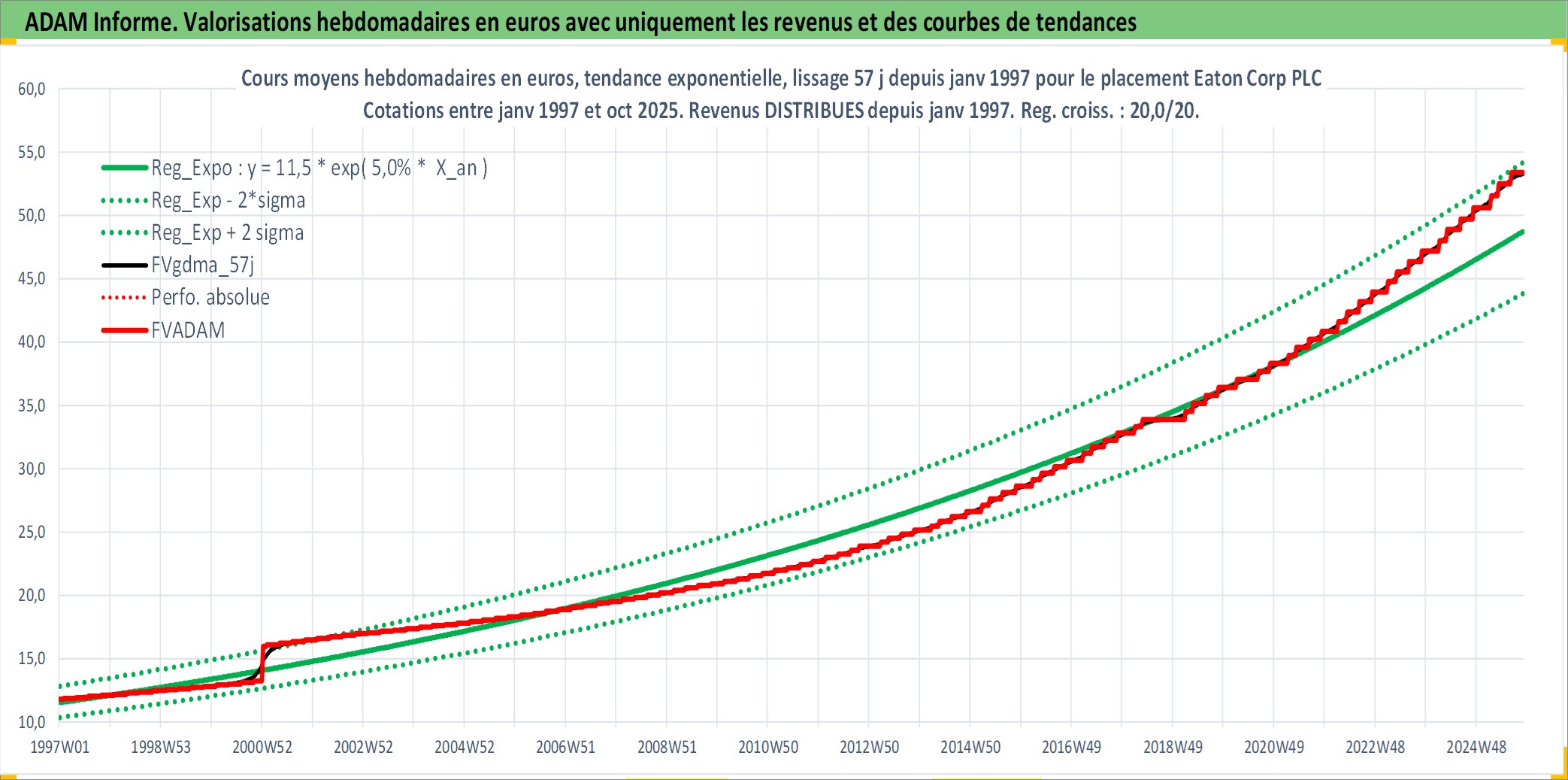 Site dédié aux investisseursPage dédiée sur site financeAnalyse des valorisations hebdomadaires de l'action Eaton Corp PLC. Cet actif est cote en USD. Les valorisations sont en contrevaleur EURO et couvrent les semaines 1997W01 a 2025W44. Les revenus de cet actif financier sont pris en compte depuis la semaine 1997W05. La note globale ESG de cet actif est estimee a 11.0 (apres rebasage entre 0 et 20).
