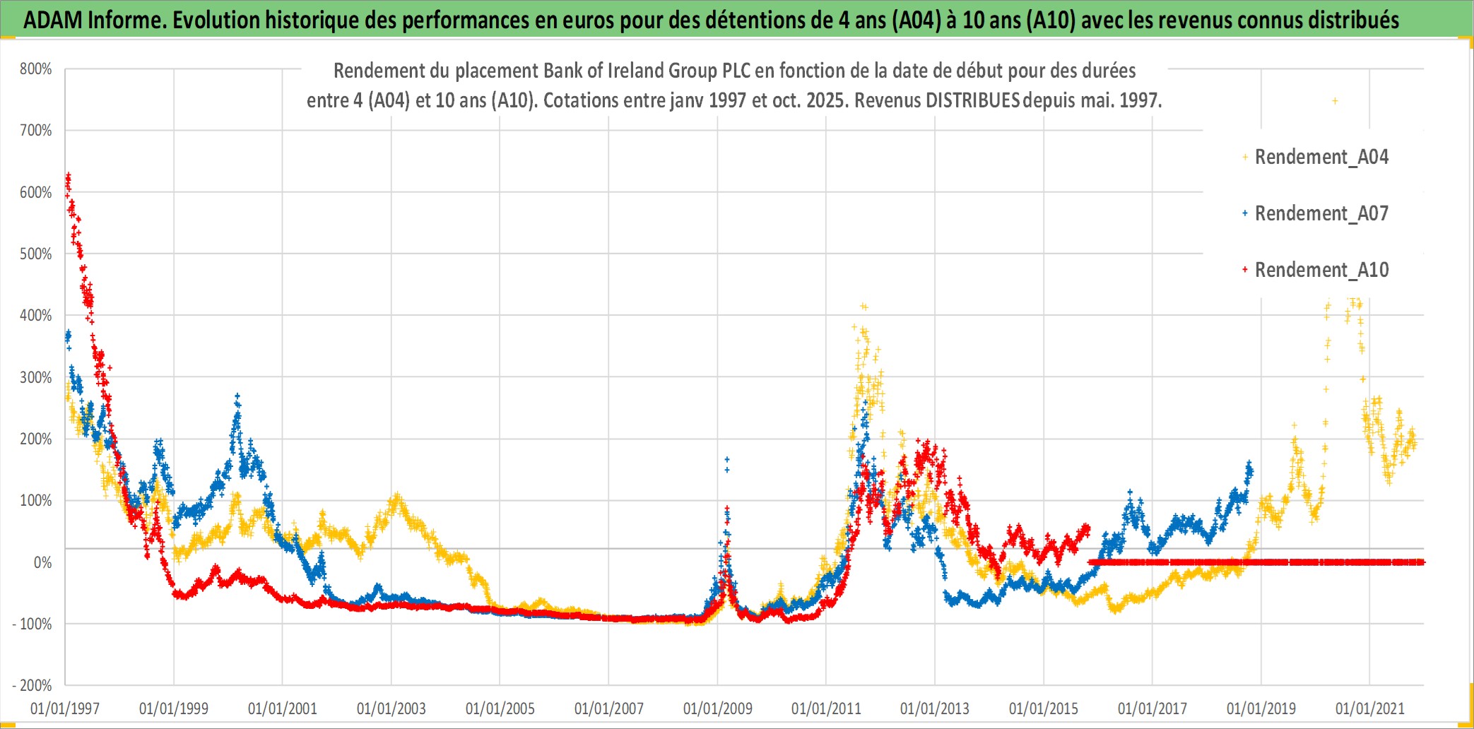 Site dédié aux investisseursPage dédiée sur site financeAnalyse des valorisations hebdomadaires de l'action Bank of Ireland Group PLC. Cet actif est cote en EUR. Les valorisations couvrent les semaines 1997W01 a 2025W44. Les revenus de cet actif financier sont pris en compte depuis la semaine 1997W22. La note globale ESG de cet actif est estimee a 10.0 (apres rebasage entre 0 et 20).