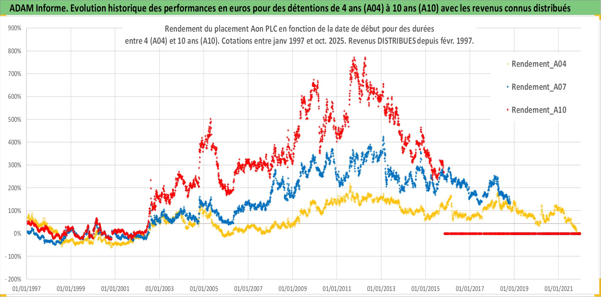Site dédié aux investisseursPage dédiée sur site financeAnalyse des valorisations hebdomadaires de l'action Aon PLC. Cet actif est cote en USD. Les valorisations sont en contrevaleur EURO et couvrent les semaines 1997W01 a 2025W44. Les revenus de cet actif financier sont pris en compte depuis la semaine 1997W06. La note ESG de cet actif n'est pas connue.