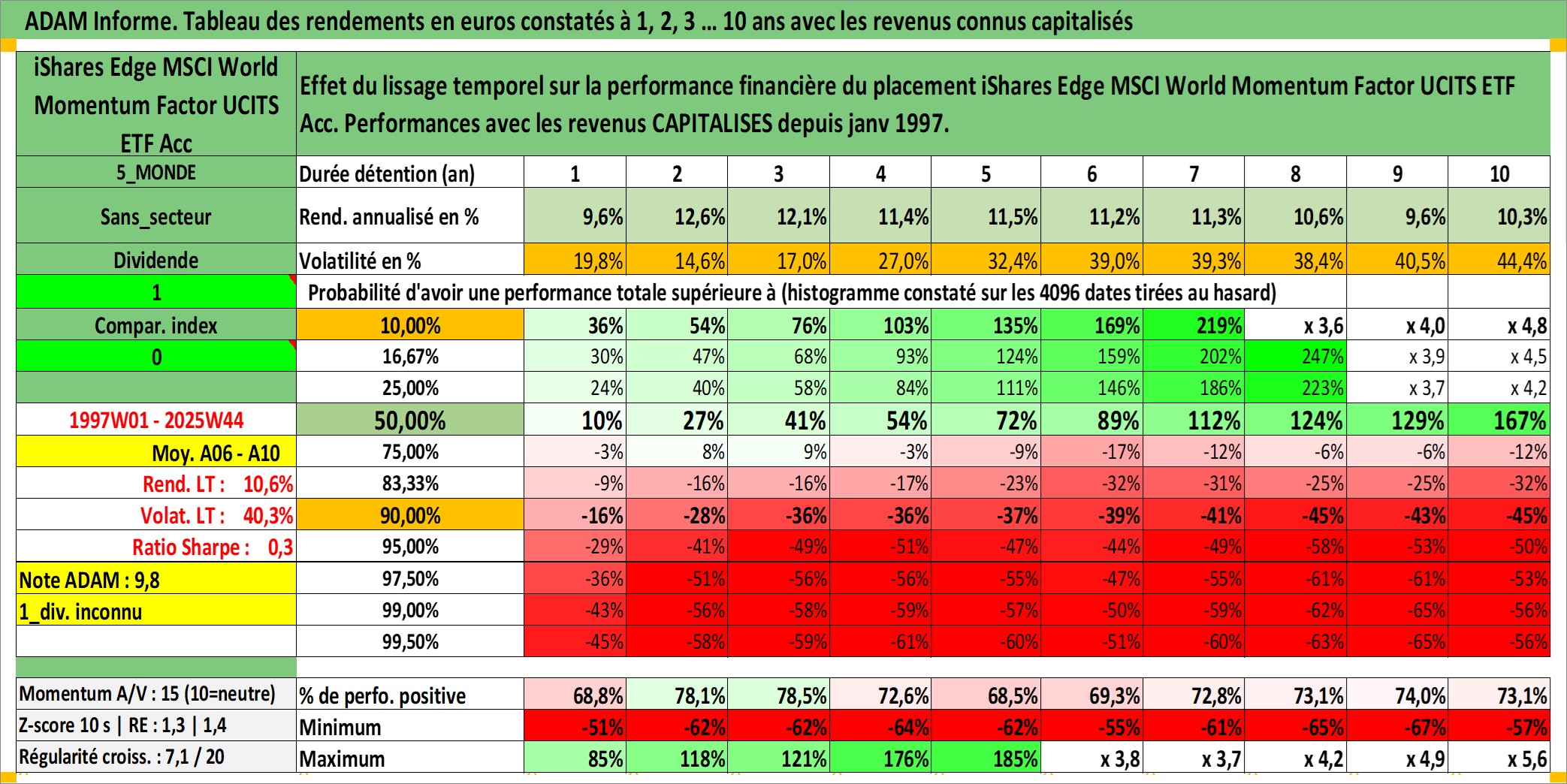 Site dédié aux investisseursPage dédiée sur site financeAnalyse des valorisations hebdomadaires du fonds iShares Edge MSCI World Momentum Factor UCITS ETF Acc. Cet actif est cote en USD. Les valorisations sont en contrevaleur EURO et couvrent les semaines 1997W01 a 2025W44. Les revenus de cet actif financier sont pris en compte depuis la semaine 1997W01. La note ESG de cet actif n'est pas connue.